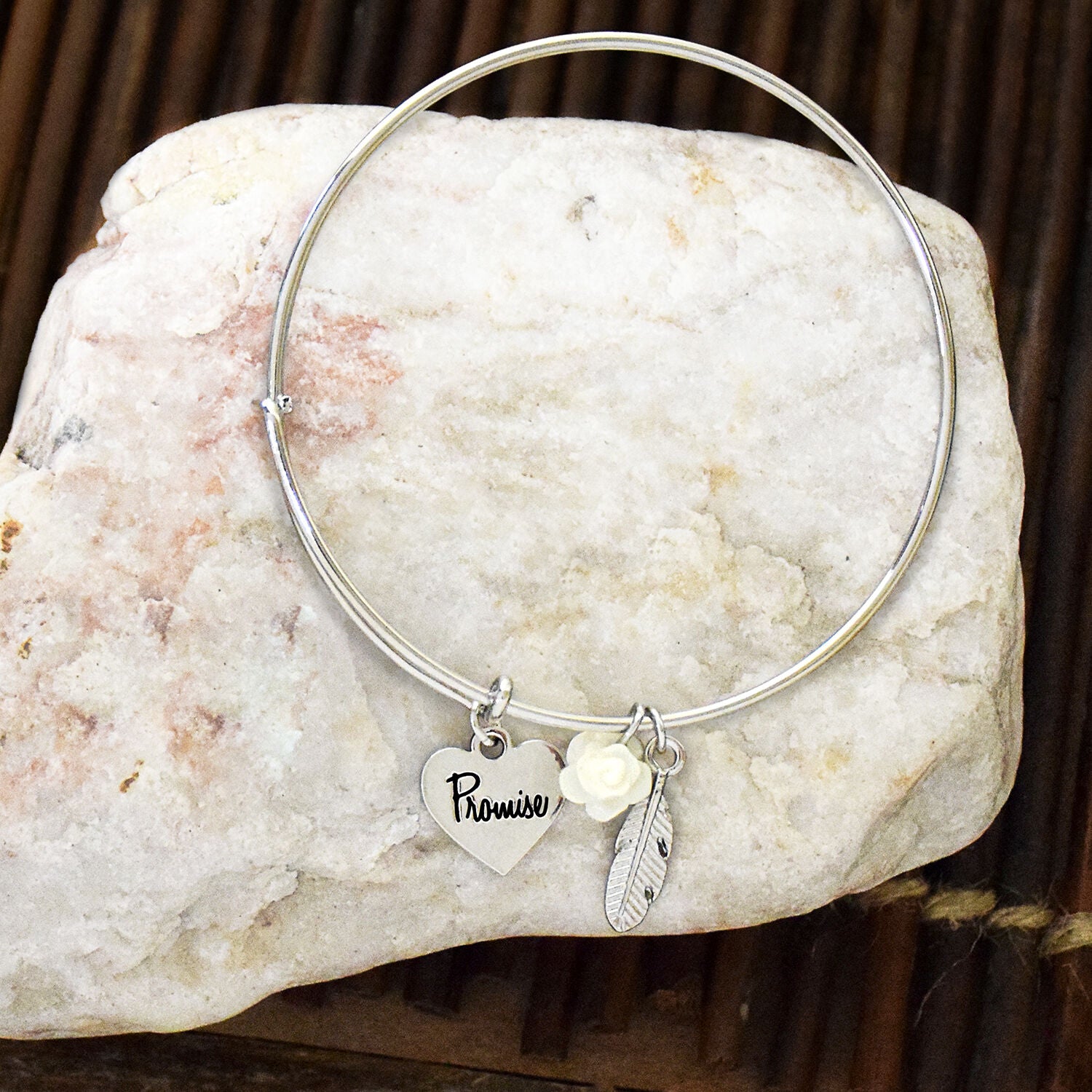 Carry a reminder of God’s unfailing love wherever you go with this elegant silver-colored bangle bracelet. Designed with three meaningful charms—a heart engraved with “promise,” a delicate feather, and a handcrafted polymer white rose—this bracelet symbolizes hope, comfort, and divine assurance. Packaged with a scripture card featuring a verse from Luke, it serves as a beautiful daily affirmation that the Lord keeps His promises. Perfect as a gift of encouragement, faith, or personal devotion.