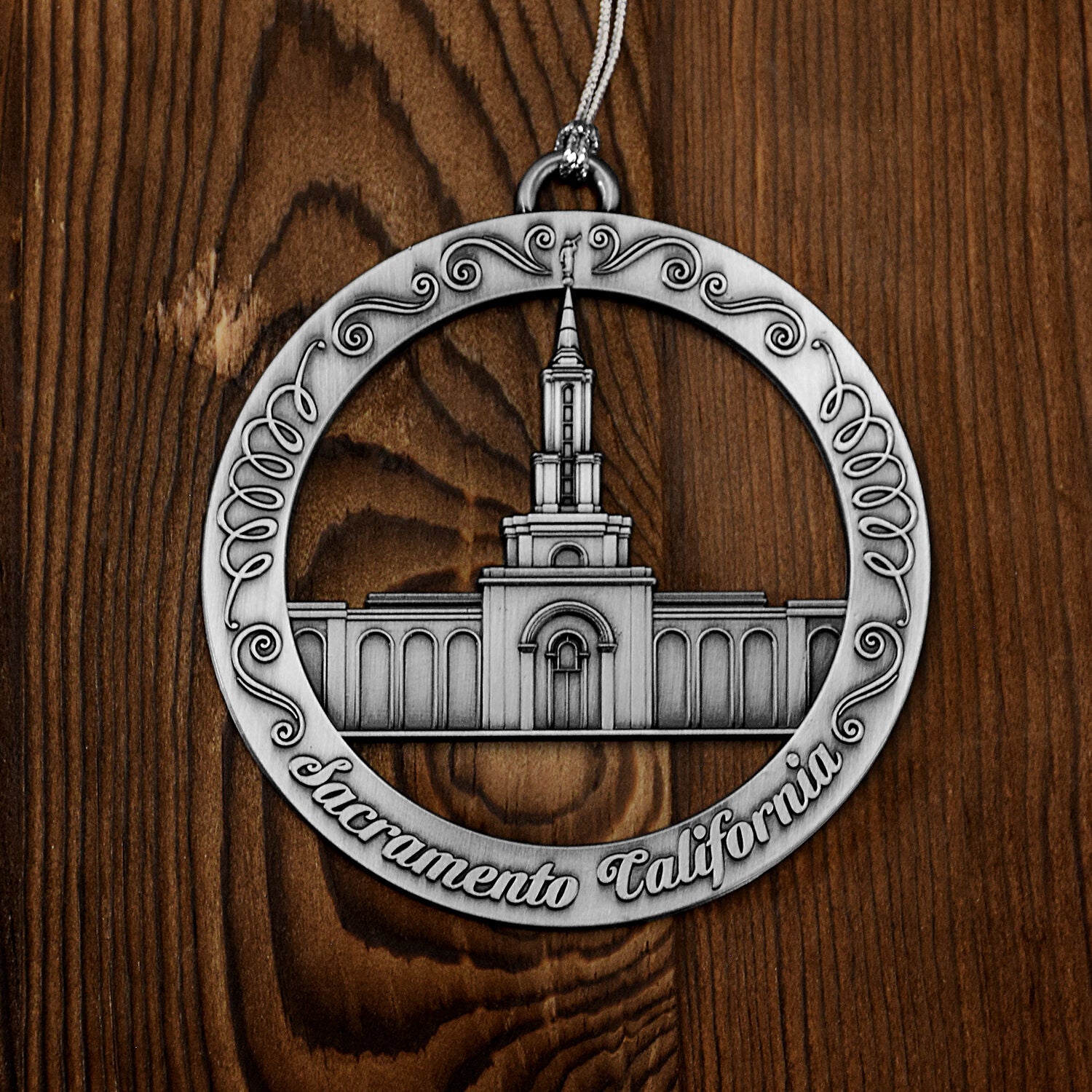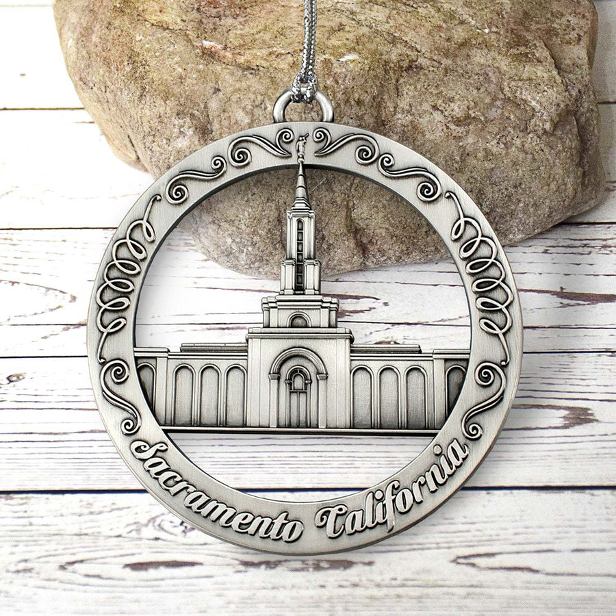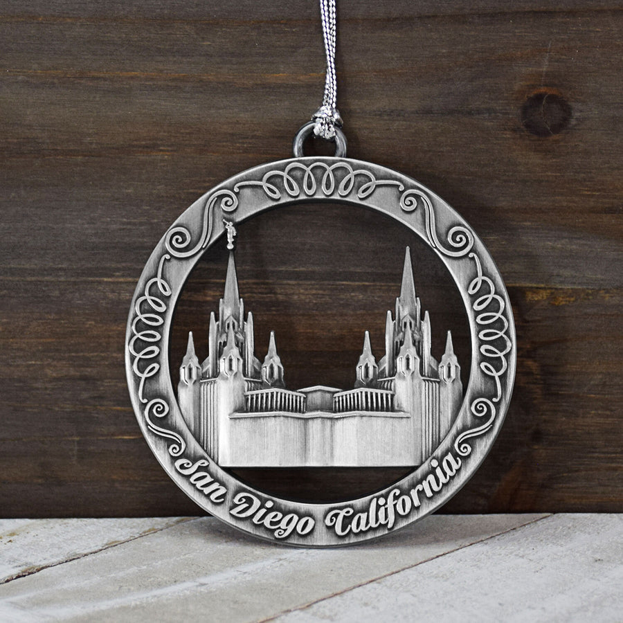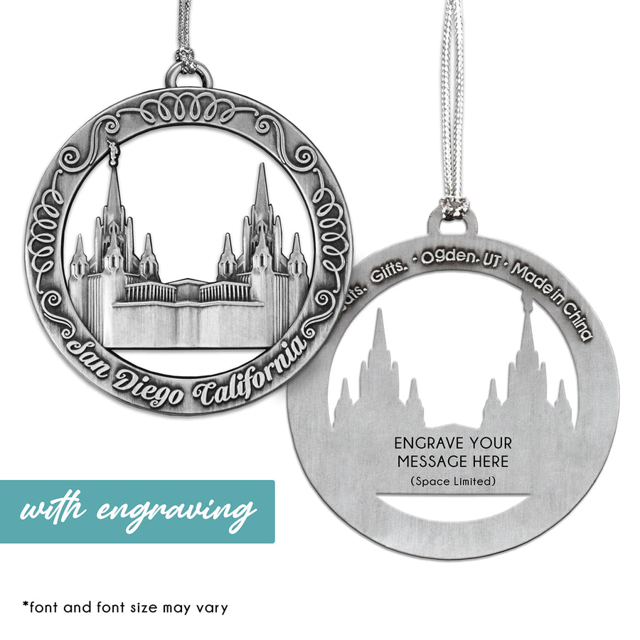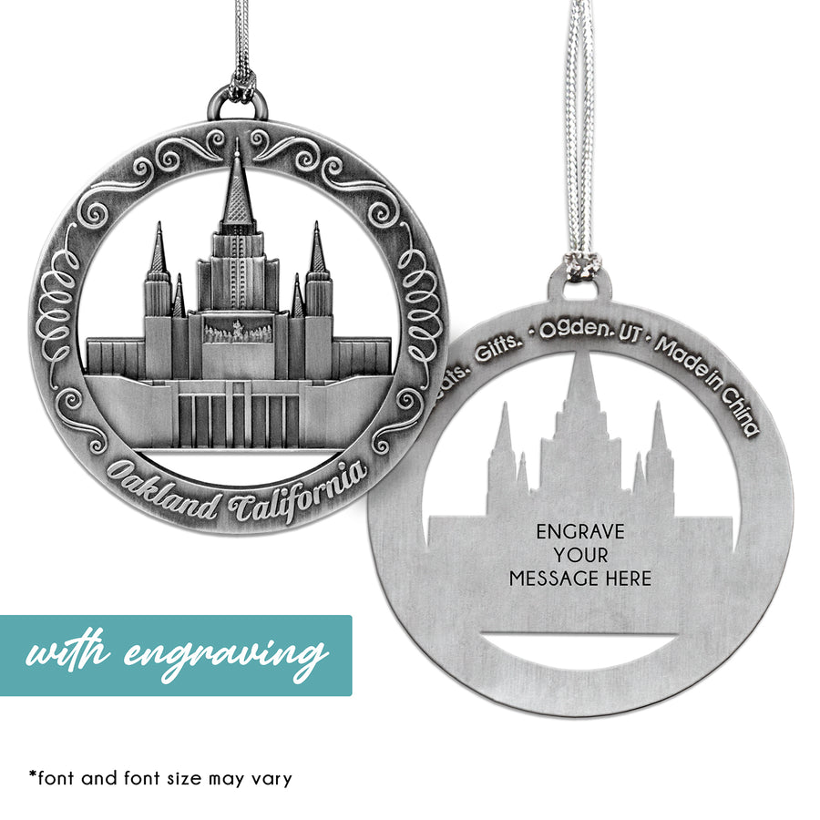 This keepsake ornament proudly displays the beautiful temple in an antique silver finish. The ornament is 3" inches in diameter...