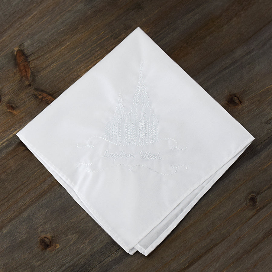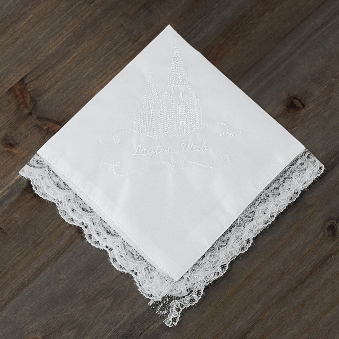 White with white embroidered image of the Layton Utah Temple Two options, one with lace, and one without.