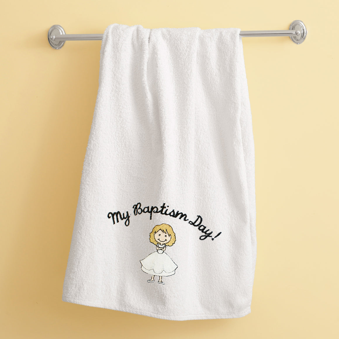 Perfect baptism gift. Embroidered is the sentence 'My Baptism Day!" and features a young blonde girl dressed in a white dress. Towel is approximately...