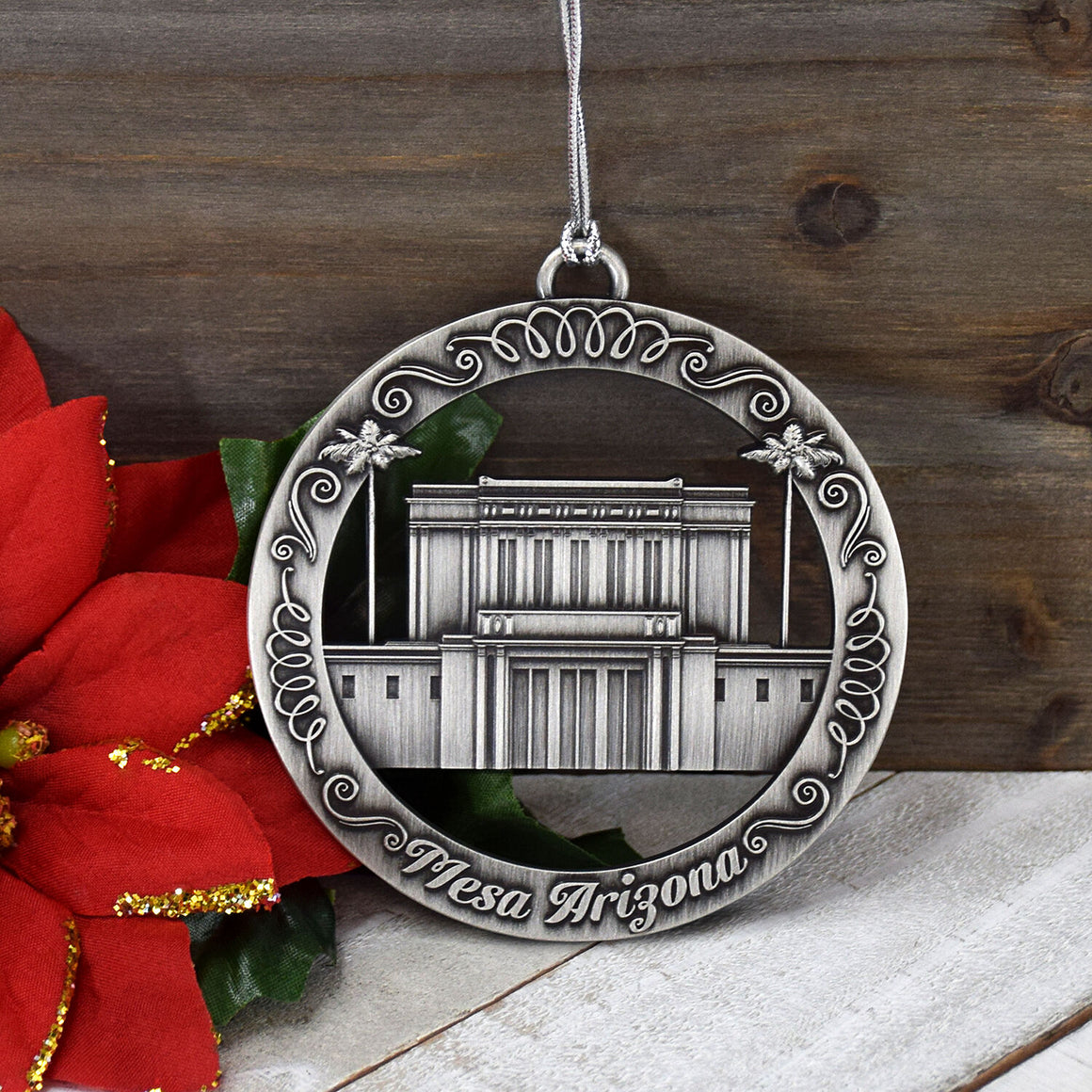 This keepsake ornament proudly displays the beautiful temple in an antique silver finish. The ornament is 3" inches in diameter...