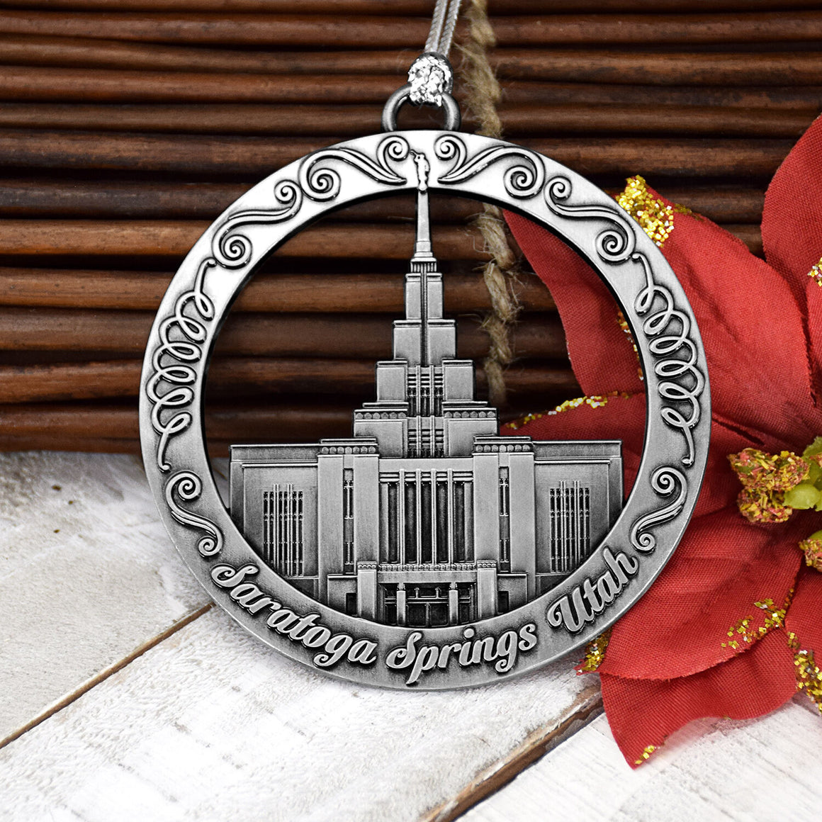 This keepsake ornament proudly displays the beautiful Saratoga Springs Utah temple in an antique silver finish. The ornament is 3"...
