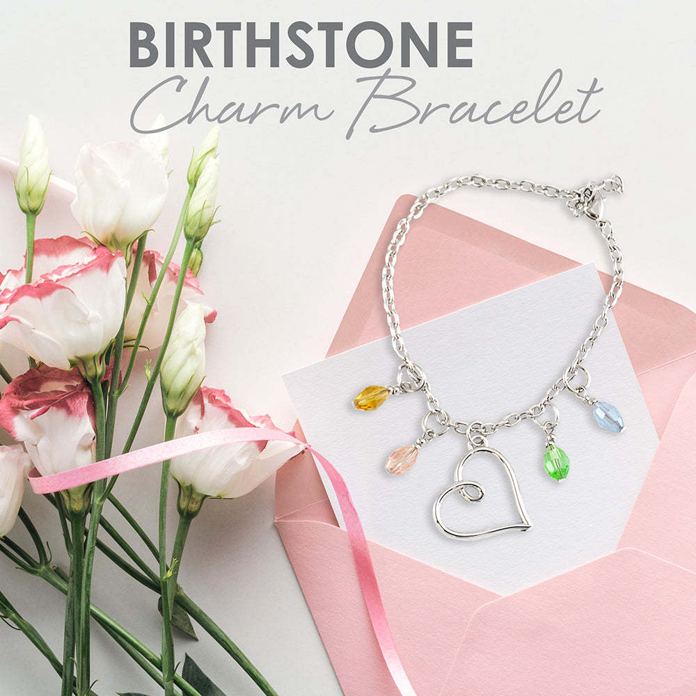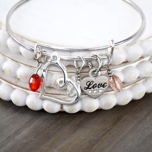 This stunning LOVE bracelet comes with 3 stone charms and 1 LOVE heart charm, completed on an adjustable bangle...