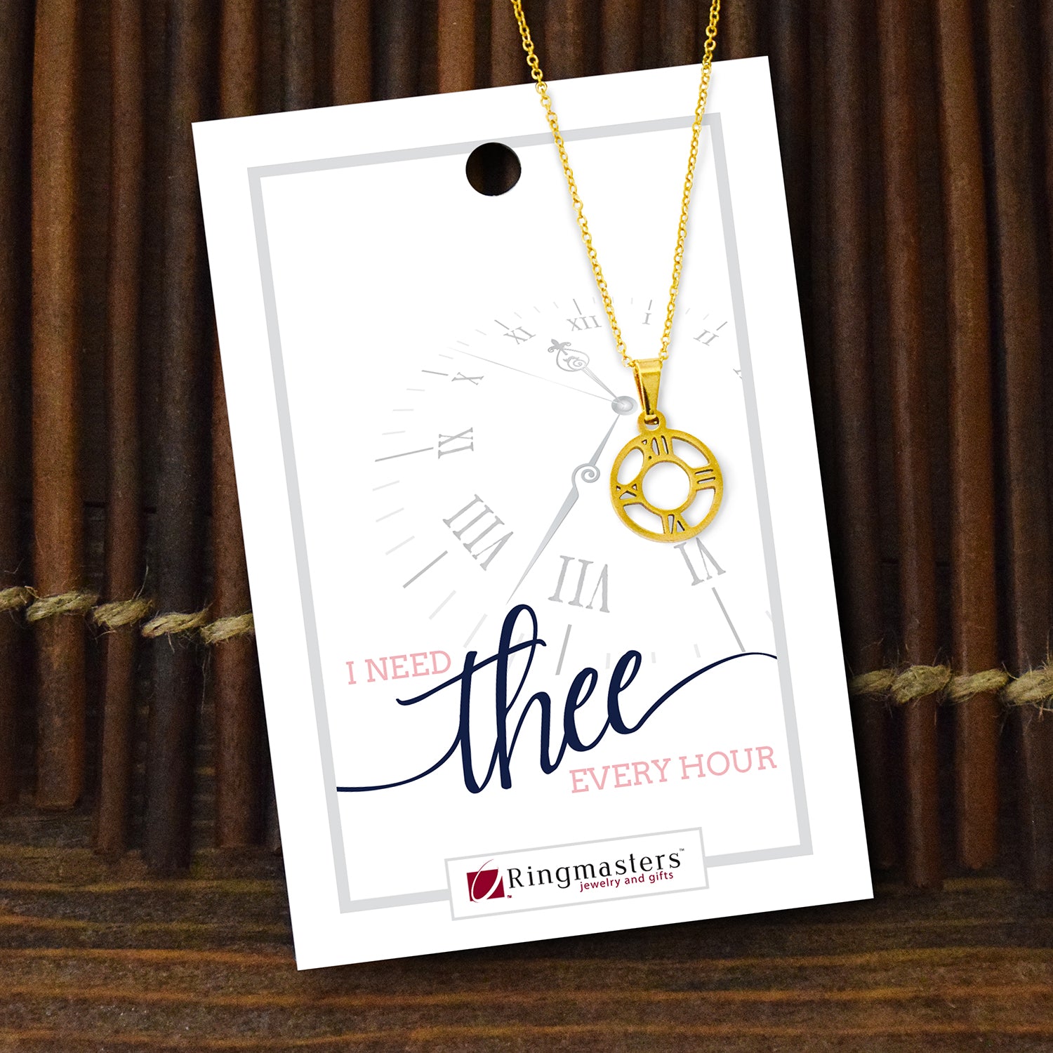 "I Need Thee Every Hour" Roman Numeral Clock Necklace – Gold Finish, 16–18" Chain A meaningful reminder of divine presence...