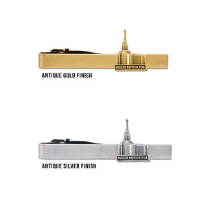 Introducing our exquisitely crafted 2.5" tie clip, a sophisticated accessory designed to elevate your ensemble with a touch of refined charm. This meticulously designed tie clip features a detailed temple charm made from zinc alloy. Crafted with precision and durability in mind, our tie clip ensures a secure grip on your tie, preventing any unwelcome slips or shifts throughout the day.  Available in both antique gold and antique silver finishes, our tie clip offers versatility to suit any occasion or personal preference. Whether you're attending a formal event or a casual gathering, this timeless accessory effortlessly complements any outfit, adding a dash of sophistication to your look. Makes a great gift for weddings, groomsman, missionaries, temple workers, birthdays, Christmas, or just because. Ask about our ward discount for 5 or more items