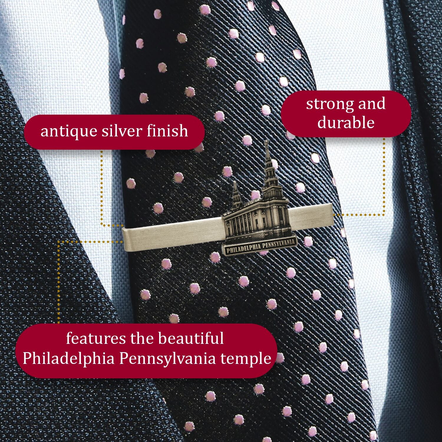Introducing our exquisitely crafted 2.5" tie clip, a sophisticated accessory designed to elevate your ensemble with a touch of refined charm. This meticulously designed tie clip features a detailed temple charm made from zinc alloy.