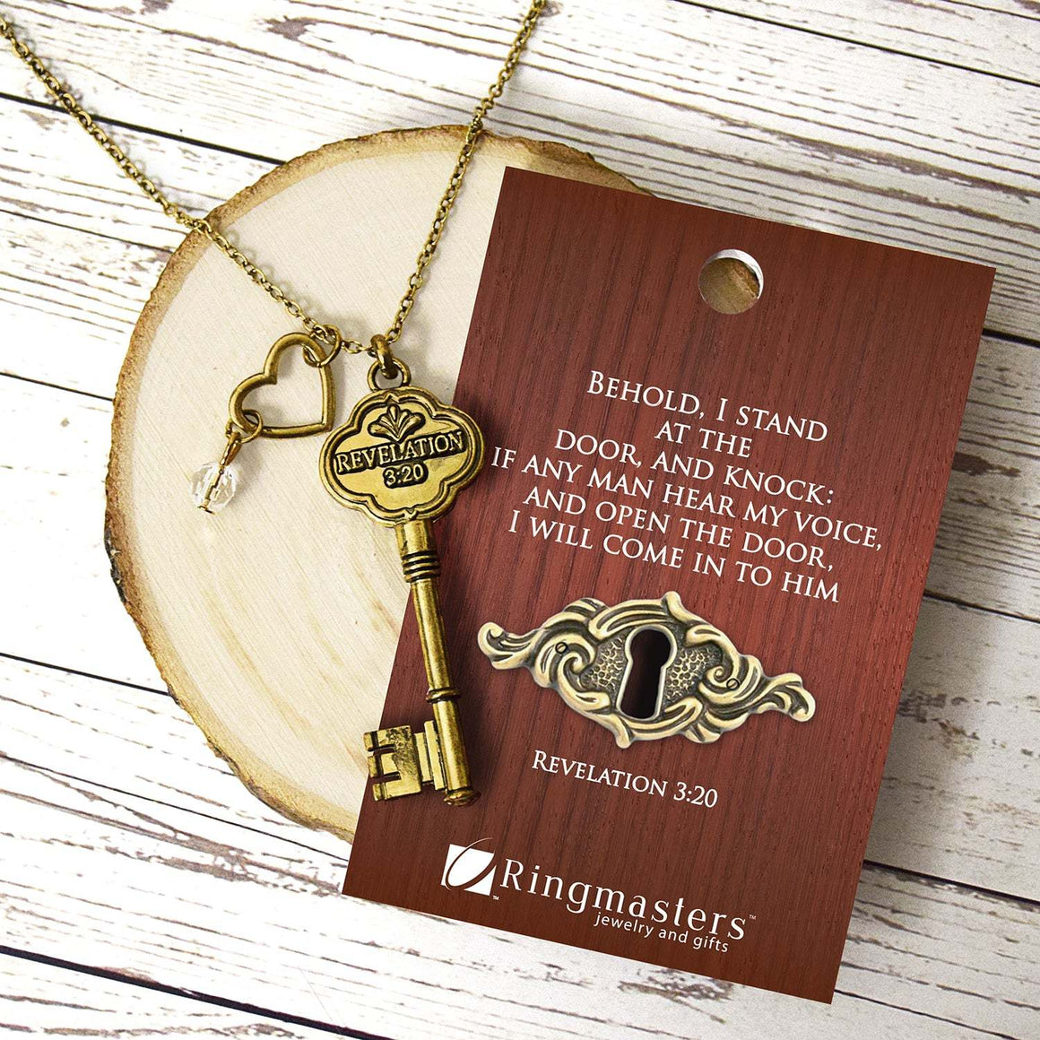 Key pendant with an antique gold finish and a 24-26" adjustable chain. "Behold, I stand at the door, and knock:...