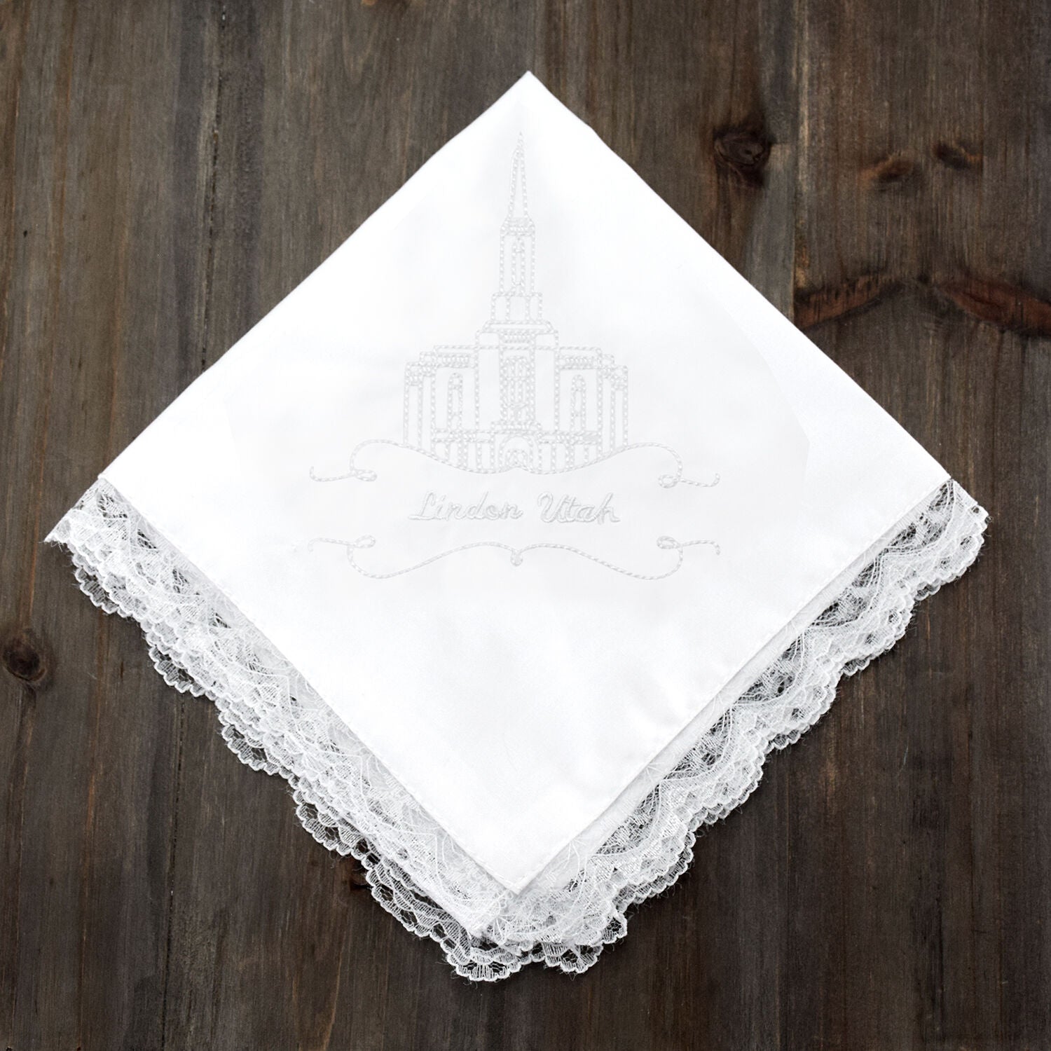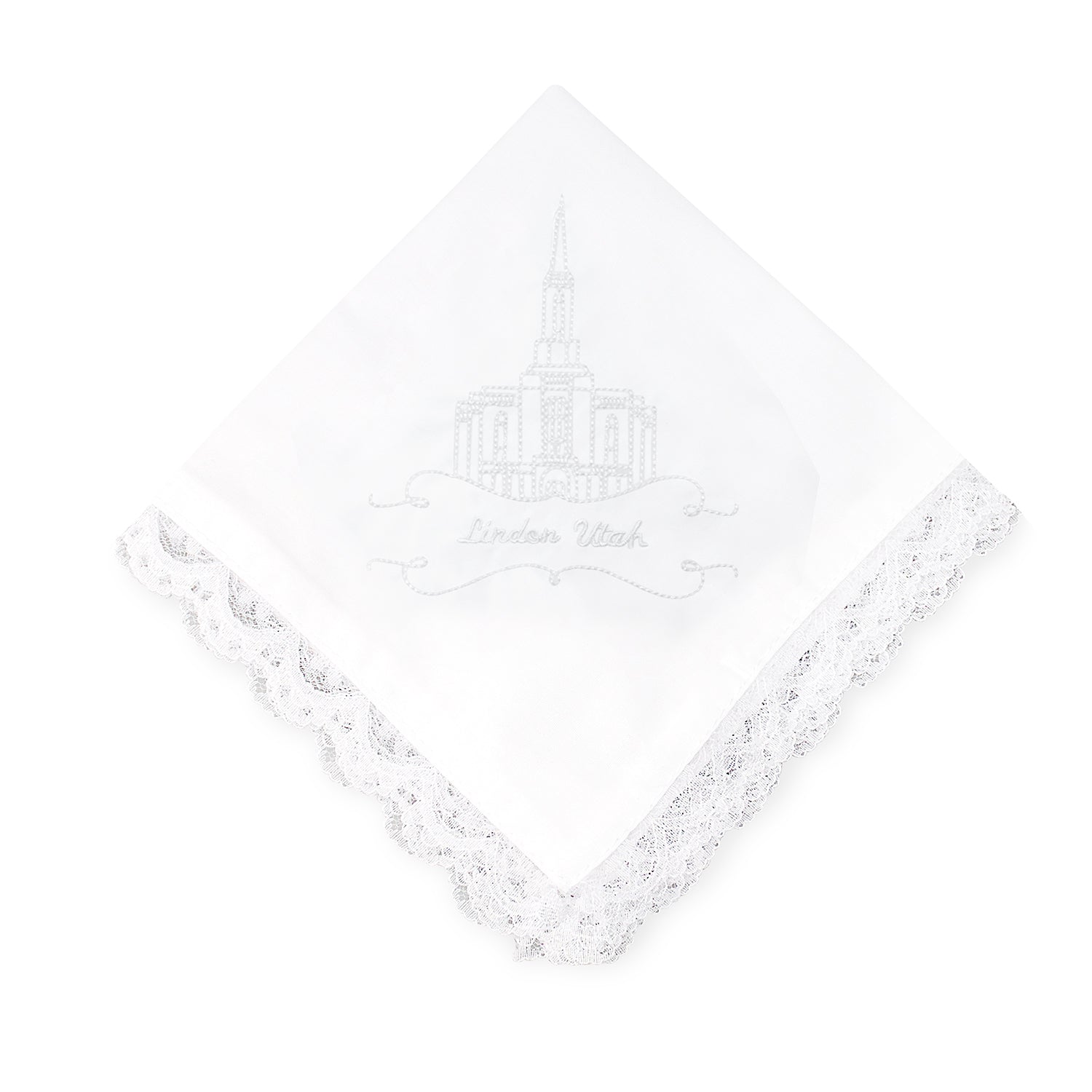 Lindon Utah Temple Embroidered Handkerchief with Lace