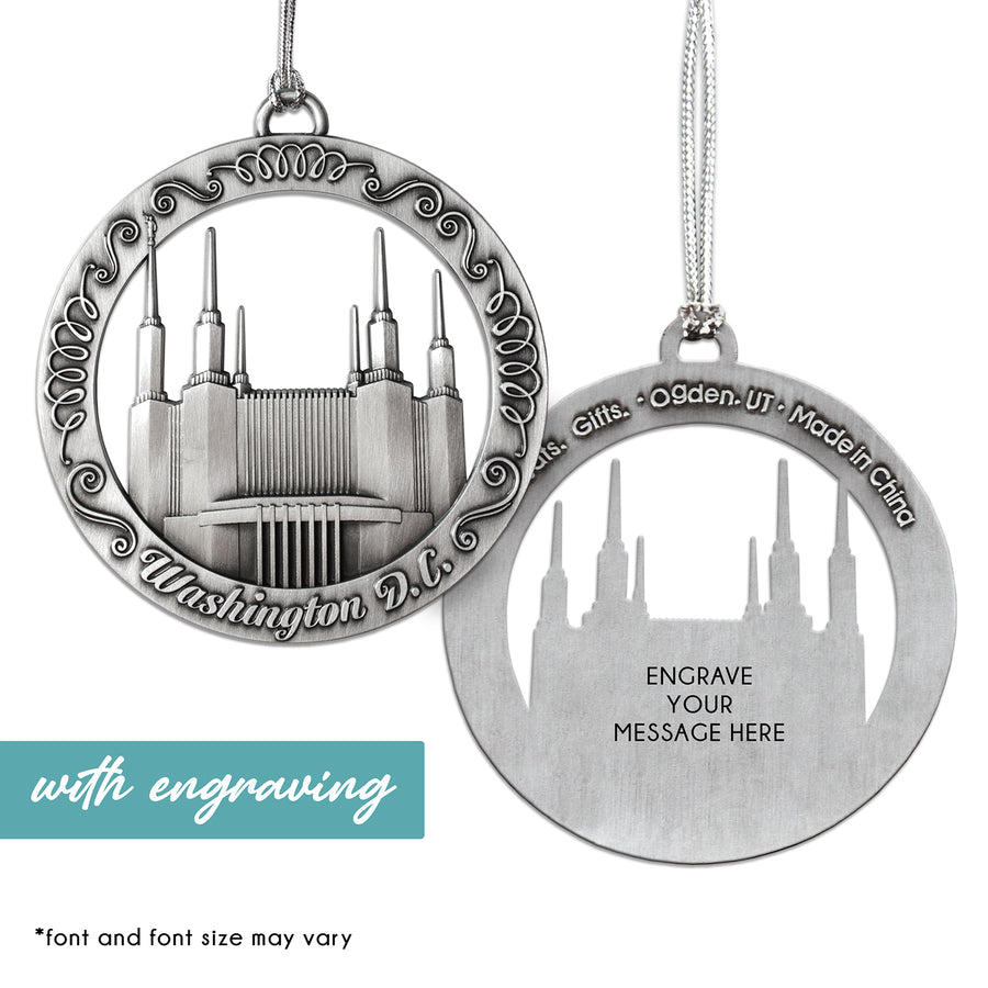 This keepsake ornament proudly displays the beautiful Meridian Idaho temple in an antique silver finish. The ornament is 3" inches in diameter and features a silver string attachment to hang on your Christmas tree or a chrome plated ornament stand also available from Ringmasters. Perfect for weddings or anniversaries, bring this beautiful temple ornament into your home.