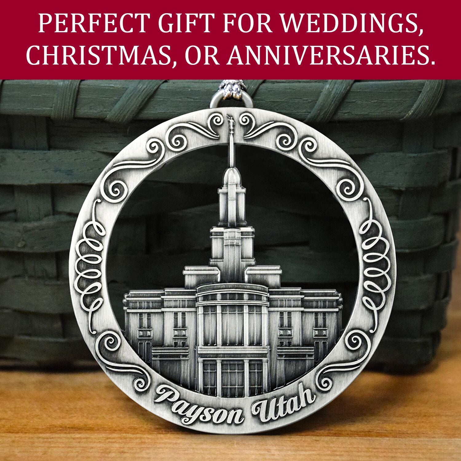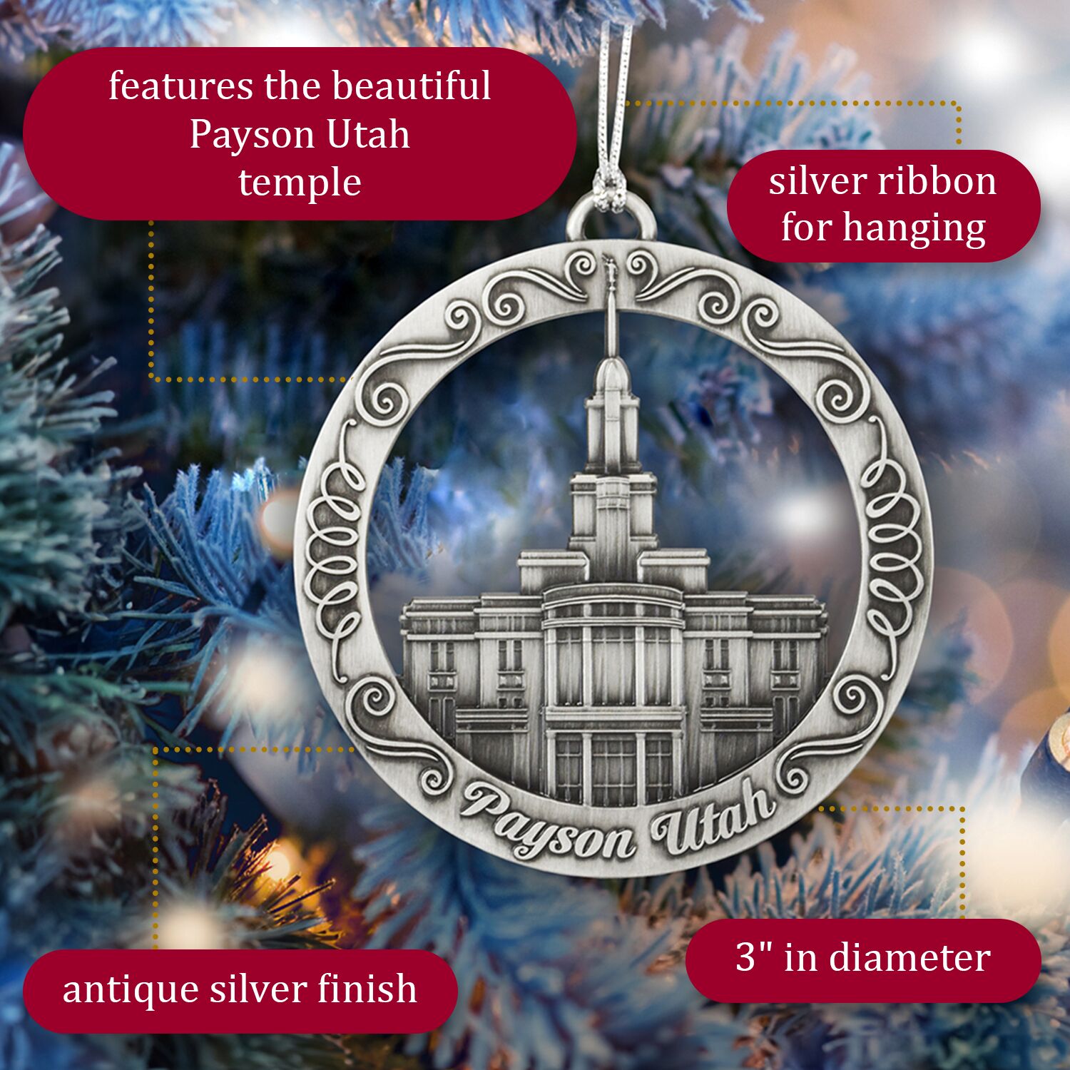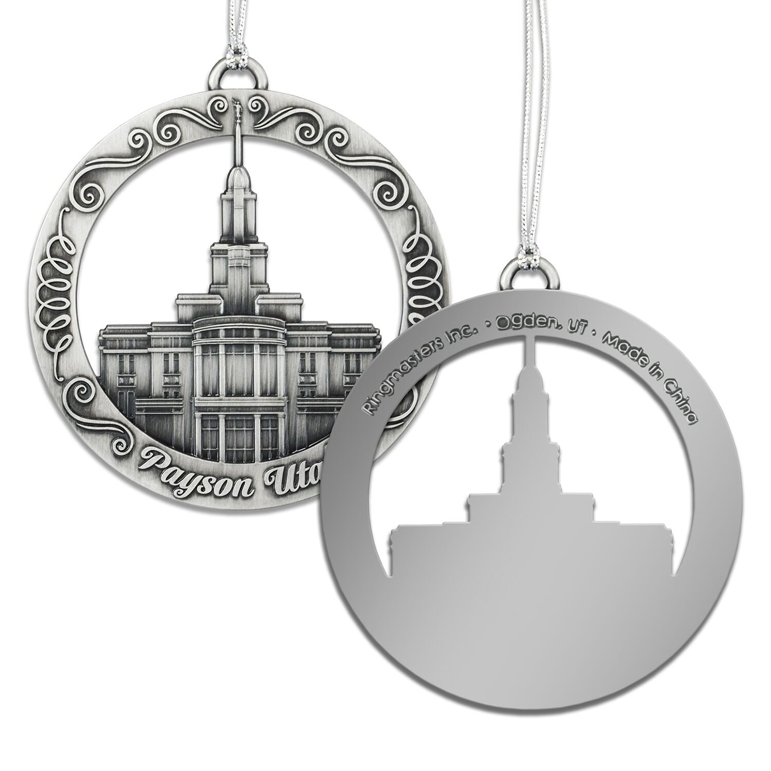 This keepsake ornament proudly displays the beautiful temple in an antique silver finish. The ornament is 3" inches in diameter and features a silver string attachment to hang on your Christmas tree or a chrome plated ornament stand also available from Ringmasters. Perfect for weddings or anniversaries, bring this beautiful temple ornament into your home.