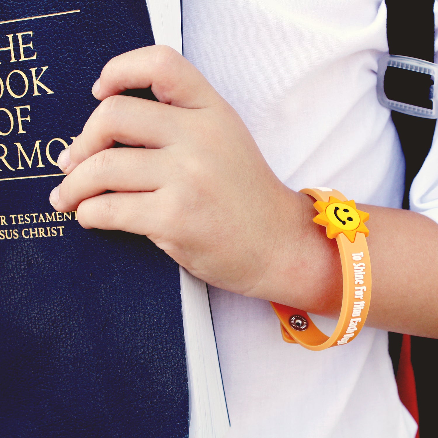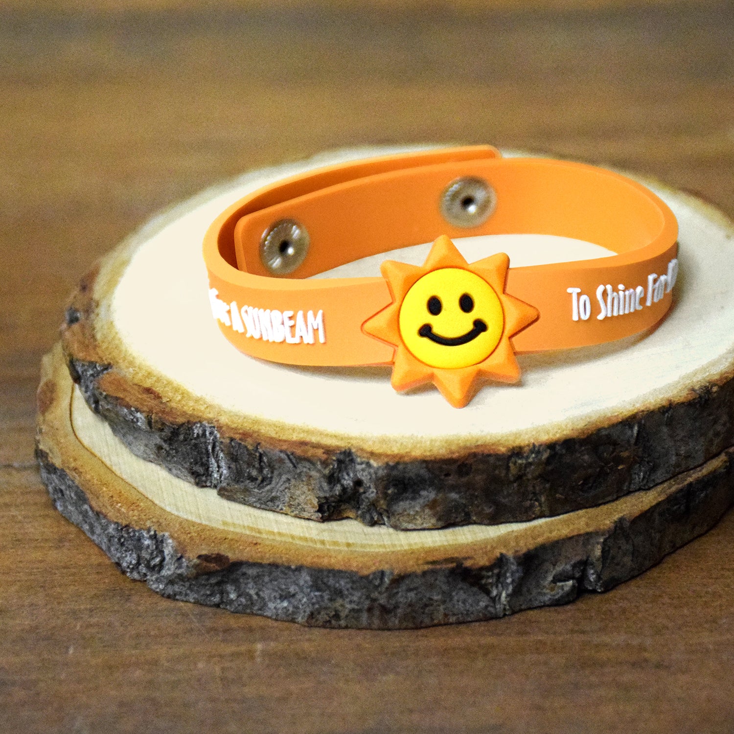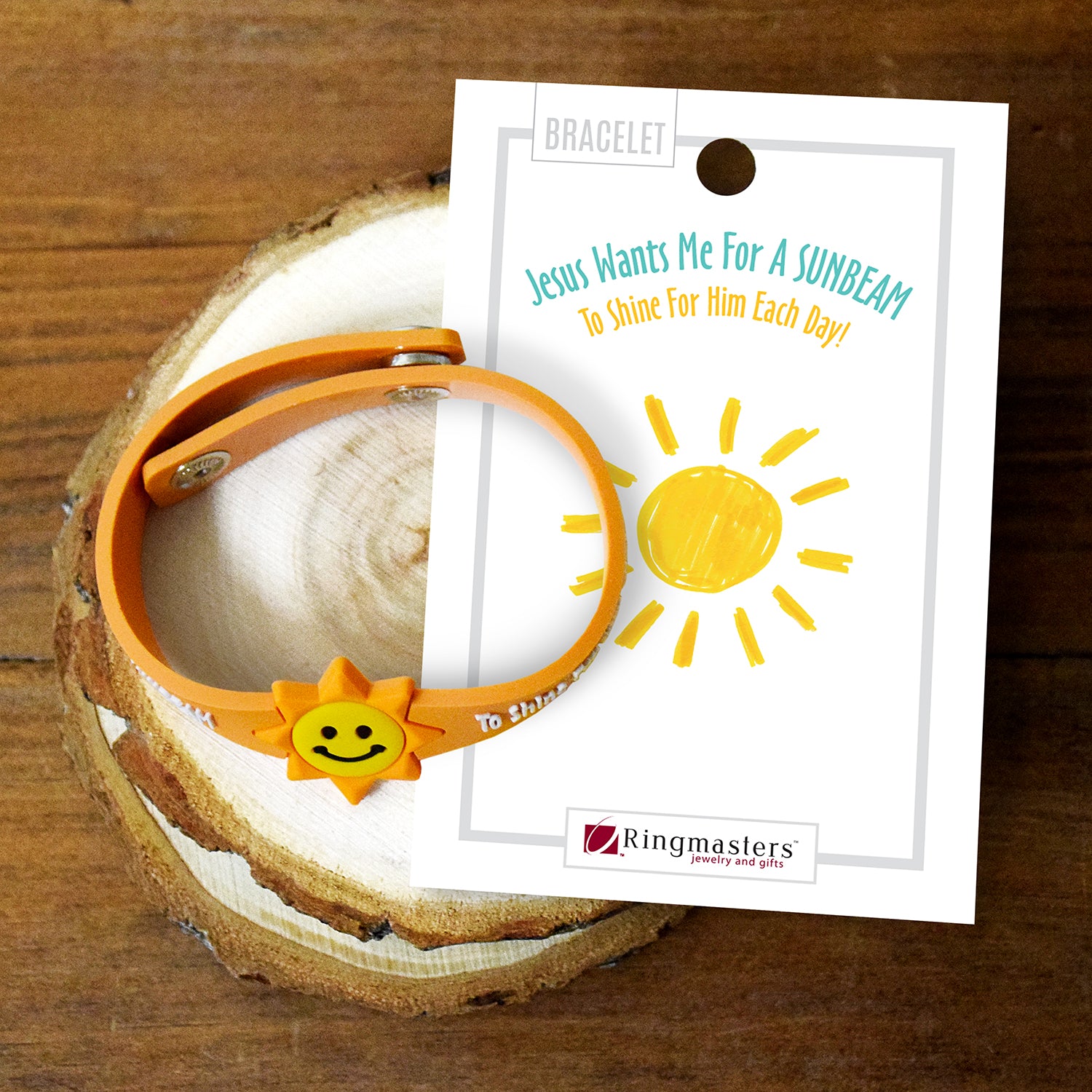 Silicone bracelet with two snaps to adjust size. Writing on side says "Jesus wants me for a sunbeam to shine for Him each day"