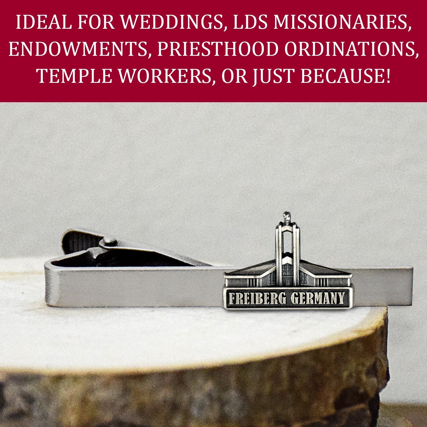 Introducing our exquisitely crafted 2.5" tie clip, a sophisticated accessory designed to elevate your ensemble with a touch of refined charm. This meticulously designed tie clip features a detailed temple charm made from zinc alloy. Crafted with precision and durability in mind, our tie clip ensures a secure grip on your tie, preventing any unwelcome slips or shifts throughout the day.  Available in both antique gold and antique silver finishes, our tie clip offers versatility to suit any occasion or personal preference. Whether you're attending a formal event or a casual gathering, this timeless accessory effortlessly complements any outfit, adding a dash of sophistication to your look. Makes a great gift for weddings, groomsman, missionaries, temple workers, birthdays, Christmas, or just because.