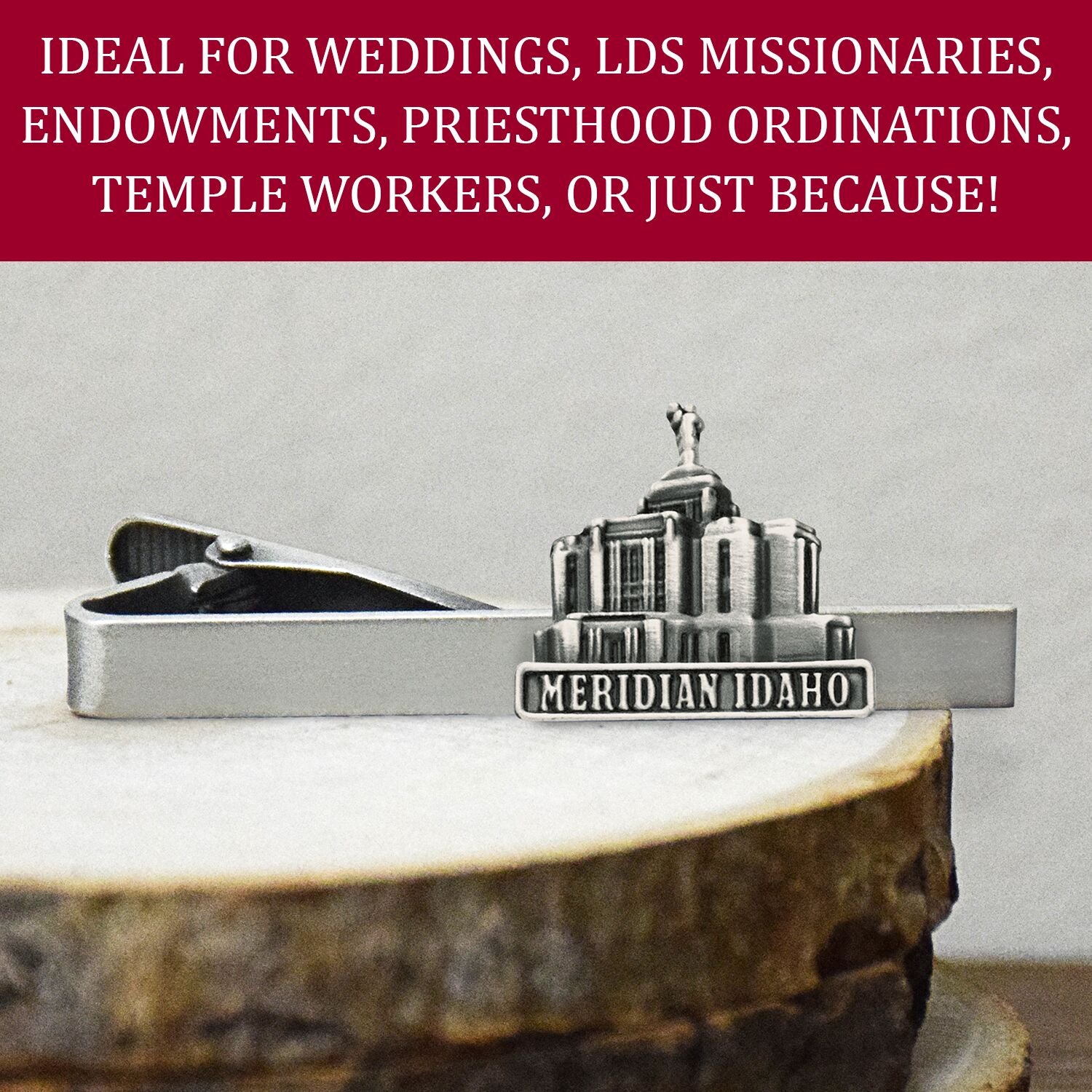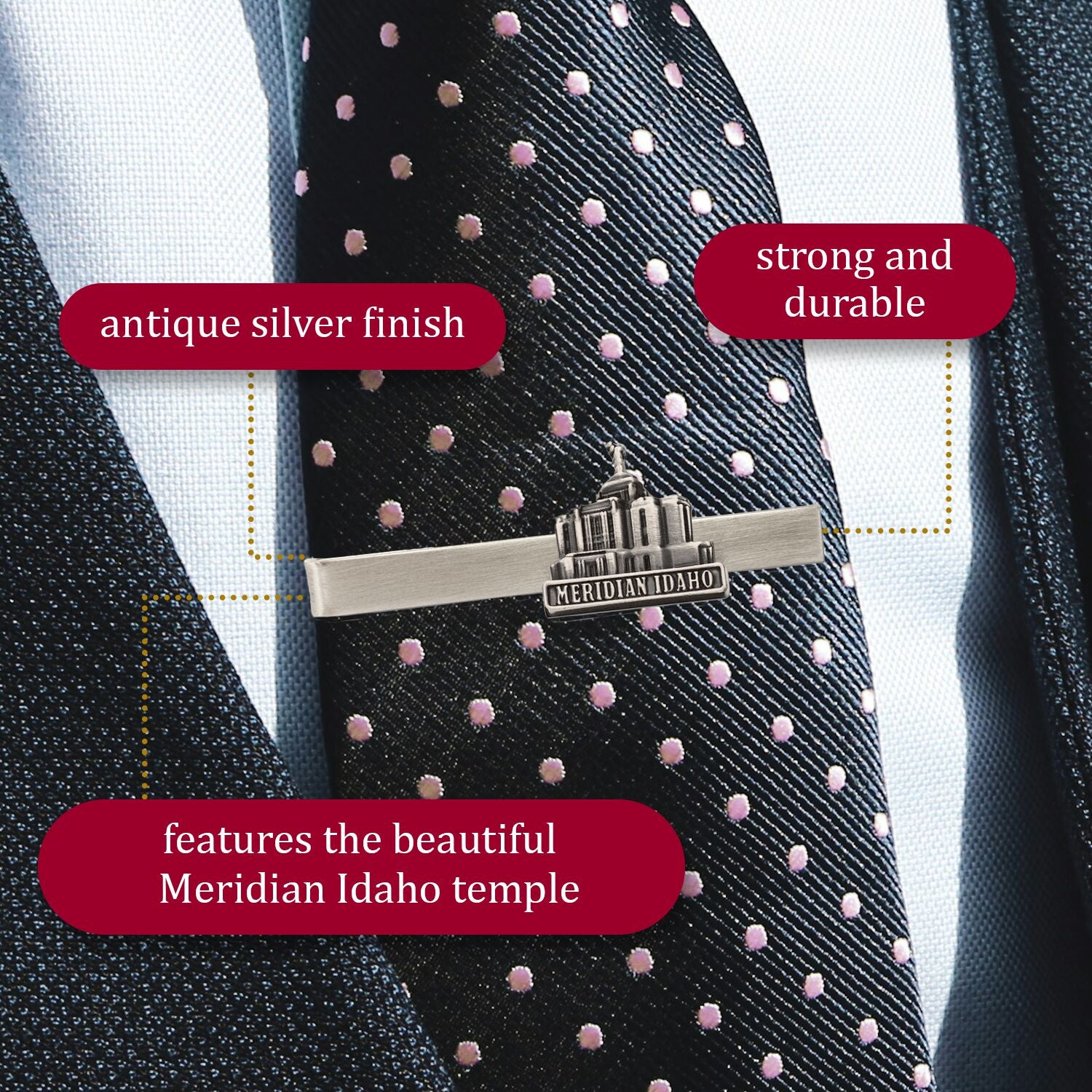 "The temple is an ever-present reminder that God intends the family to be eternal." - Ezra Taft Benson. This antique silver finish tie bar beautifully represents the Meridian temple and makes the perfect gift for men and young men. Strong and durable clip prevents slipping down the shirt and tie. Comes with Ringmasters lifetime warranty.