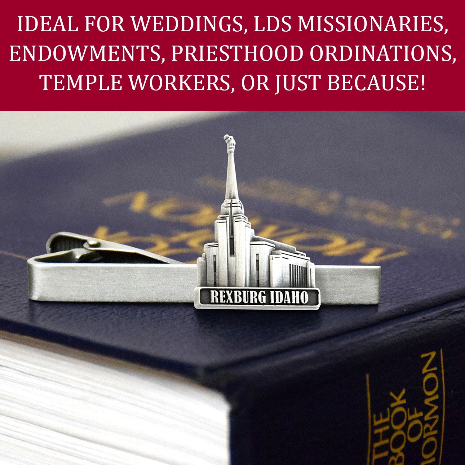 Introducing our exquisitely crafted 2.5" tie clip, a sophisticated accessory designed to elevate your ensemble with a touch of refined charm. This meticulously designed tie clip features a detailed temple charm made from zinc alloy. Crafted with precision and durability in mind, our tie clip ensures a secure grip on your tie, preventing any unwelcome slips or shifts throughout the day.  Available in both antique gold and antique silver finishes, our tie clip offers versatility to suit any occasion or personal preference. Whether you're attending a formal event or a casual gathering, this timeless accessory effortlessly complements any outfit, adding a dash of sophistication to your look. Makes a great gift for weddings, groomsman, missionaries, temple workers, birthdays, Christmas, or just because. Ask about our ward discount for 5 or more items
