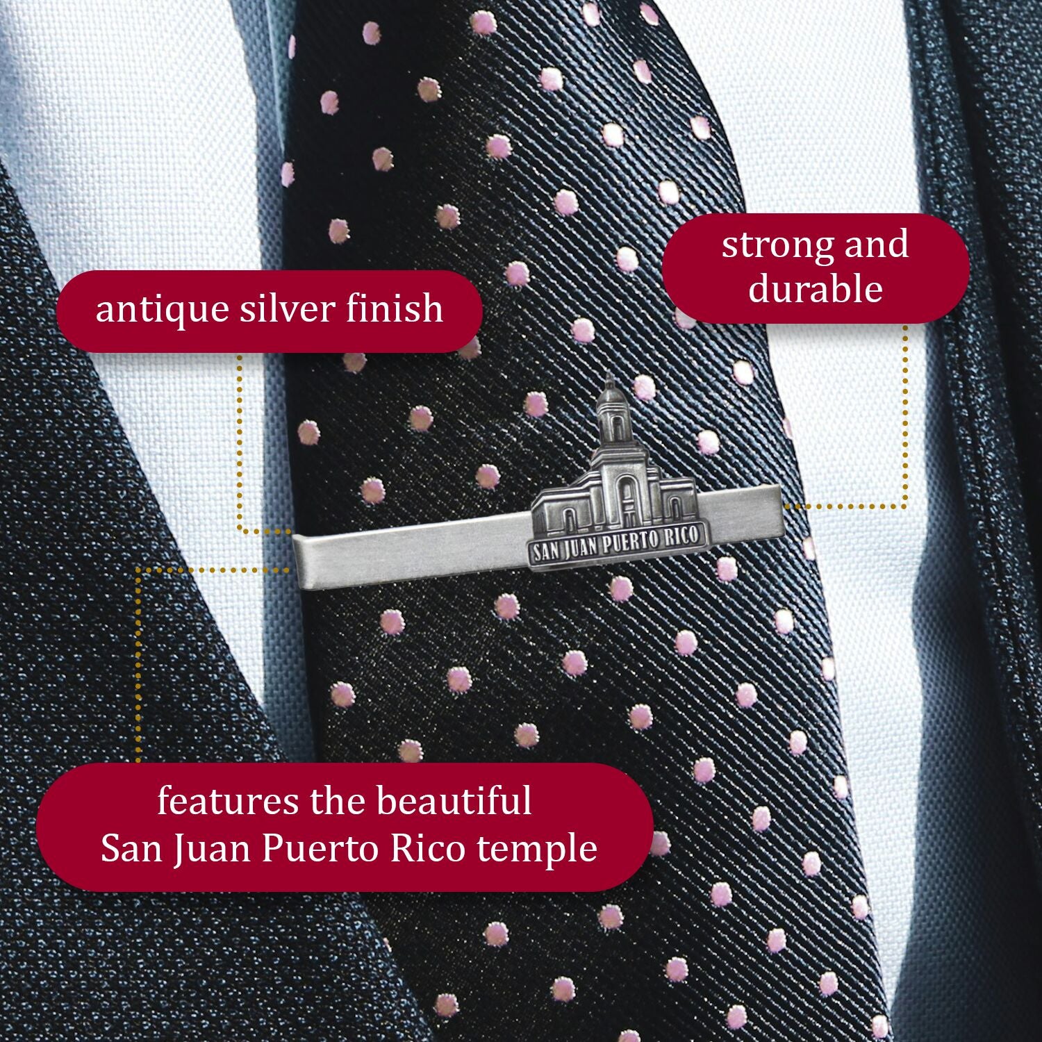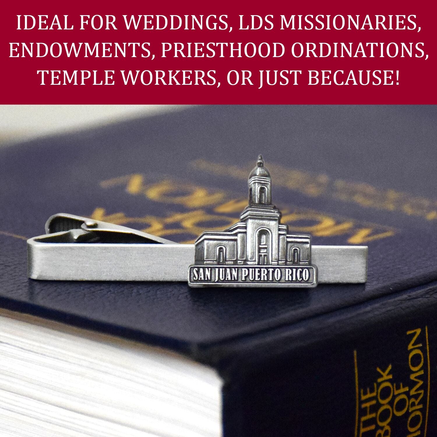 This antique silver finish tie clip beautifully represents the San Juan Puerto Rico temple and makes the perfect gift for men and young men. Strong and durable clip prevents slipping down the shirt and tie. Comes with Ringmasters lifetime warranty.