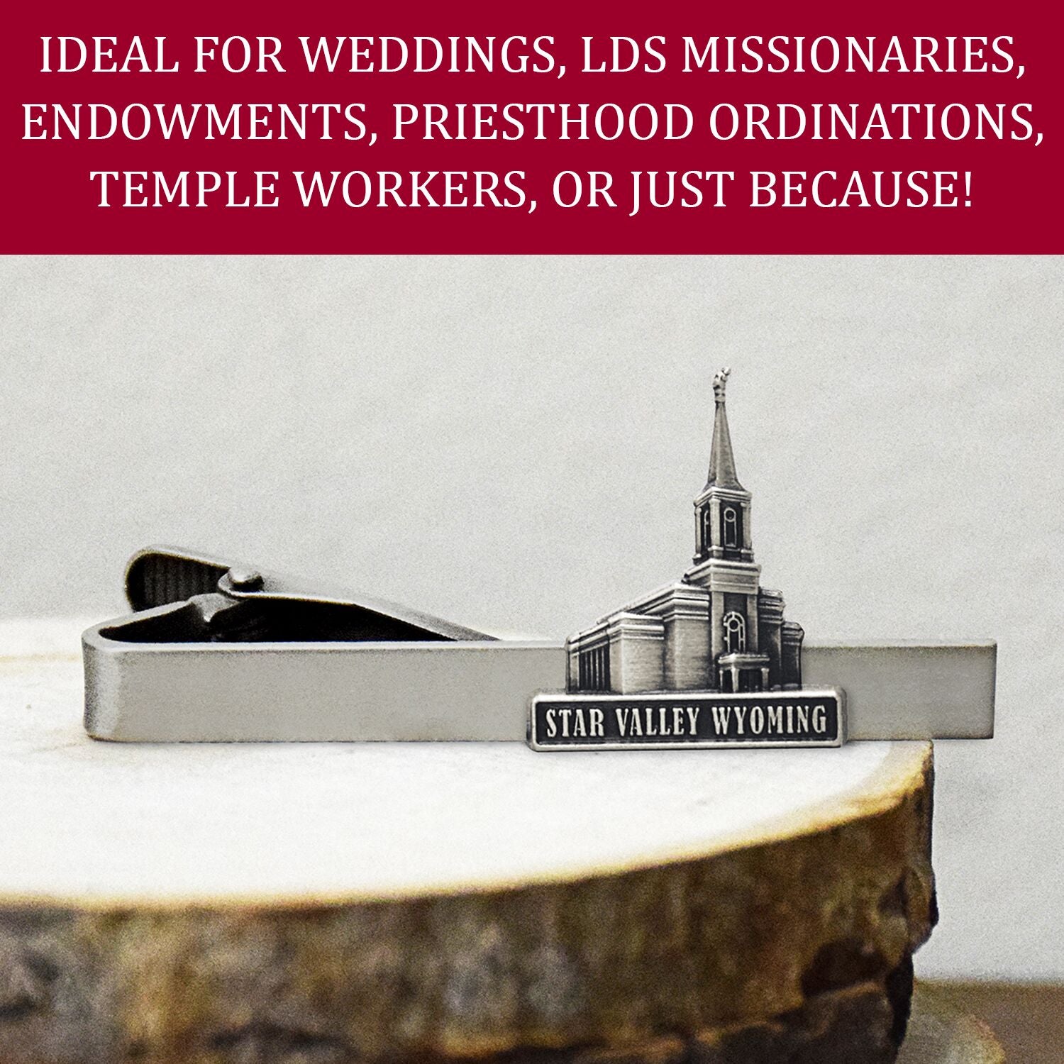 "The temple is an ever-present reminder that God intends the family to be eternal." - Ezra Taft Benson. This antique silver finish tie bar beautifully represents the Star Valley temple and makes the perfect gift for men and young men. Strong and durable clip prevents slipping down the shirt and tie. Comes with Ringmasters lifetime warranty.