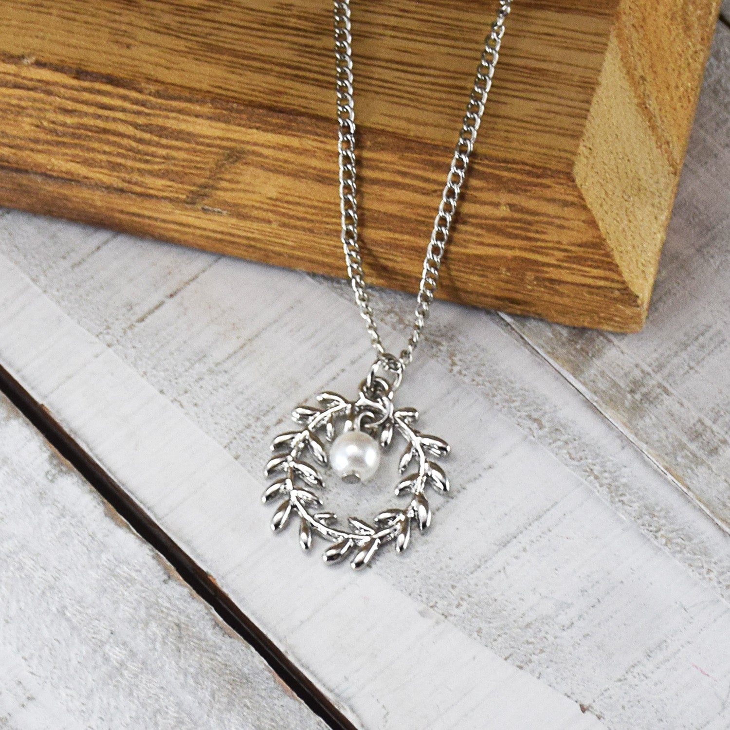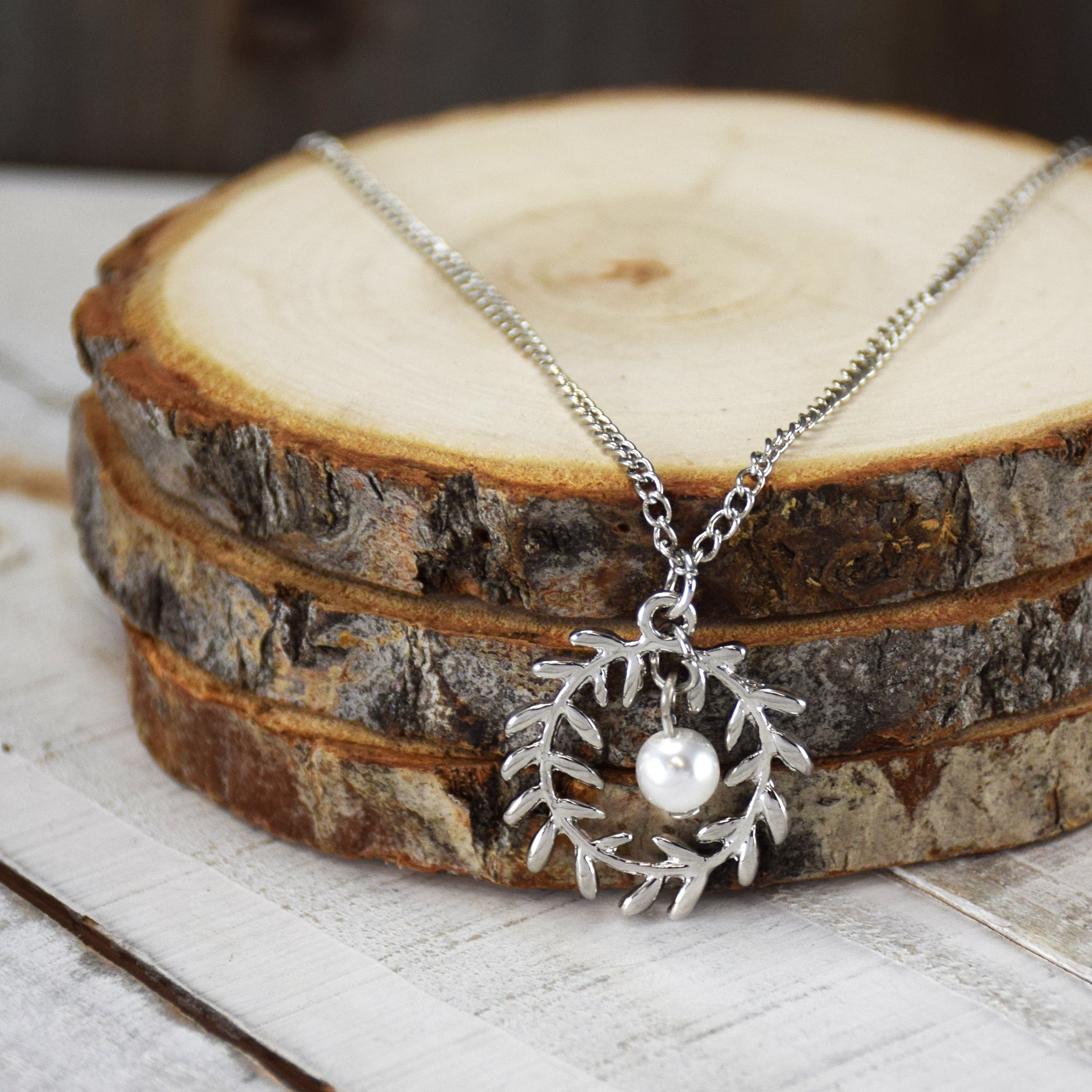 The necklace features a circular leaf-patterned pendant with a pearl delicately dangling in the center, symbolizing purity, growth, and faith. It comes on an adjustable 18–20" chain, making it versatile and comfortable for daily wear.