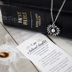 Young Women Theme Necklace & Bookmark Gift Set – Pearl Pendant with Leaf Circle Design