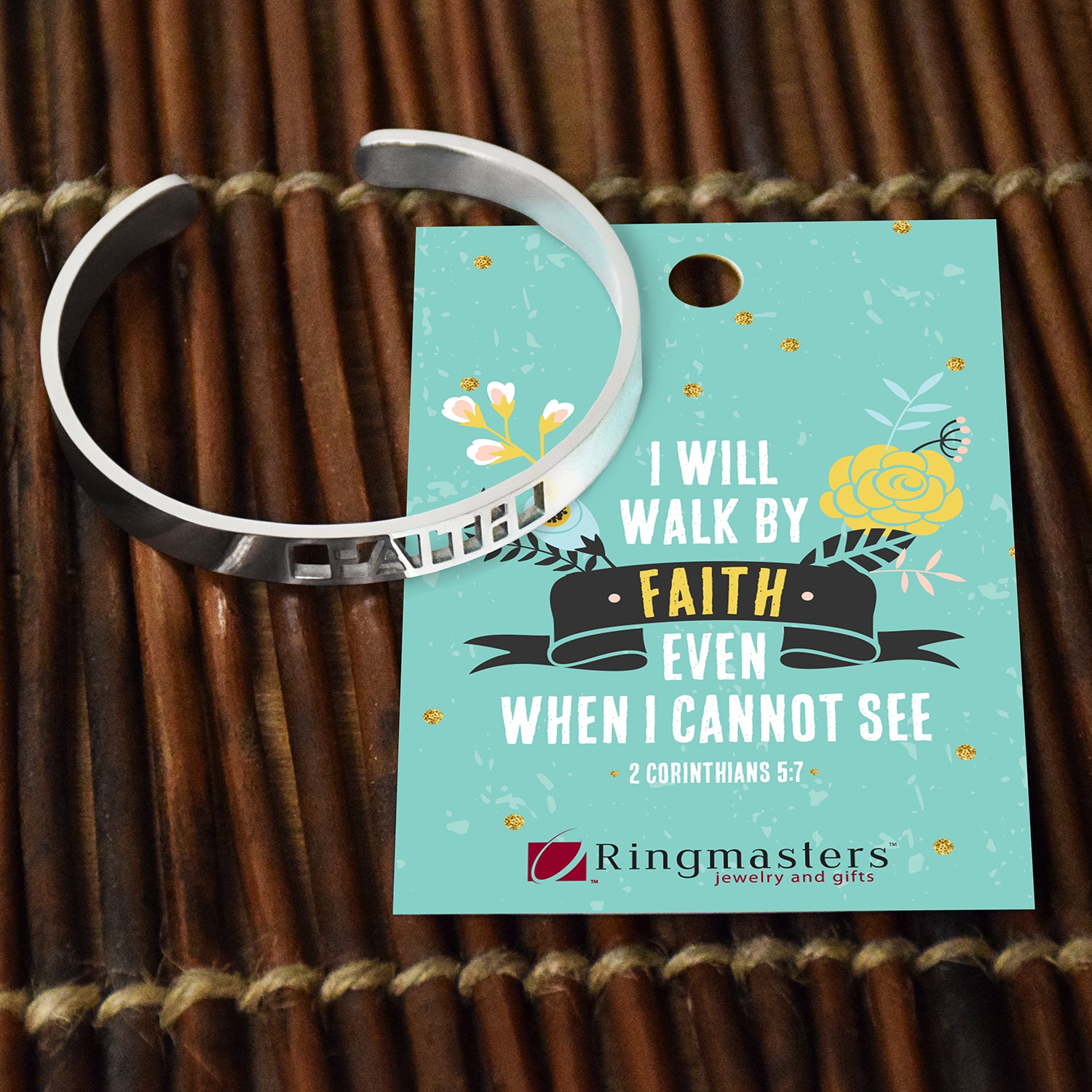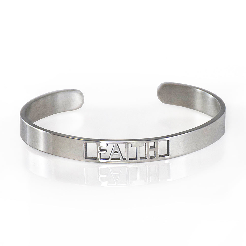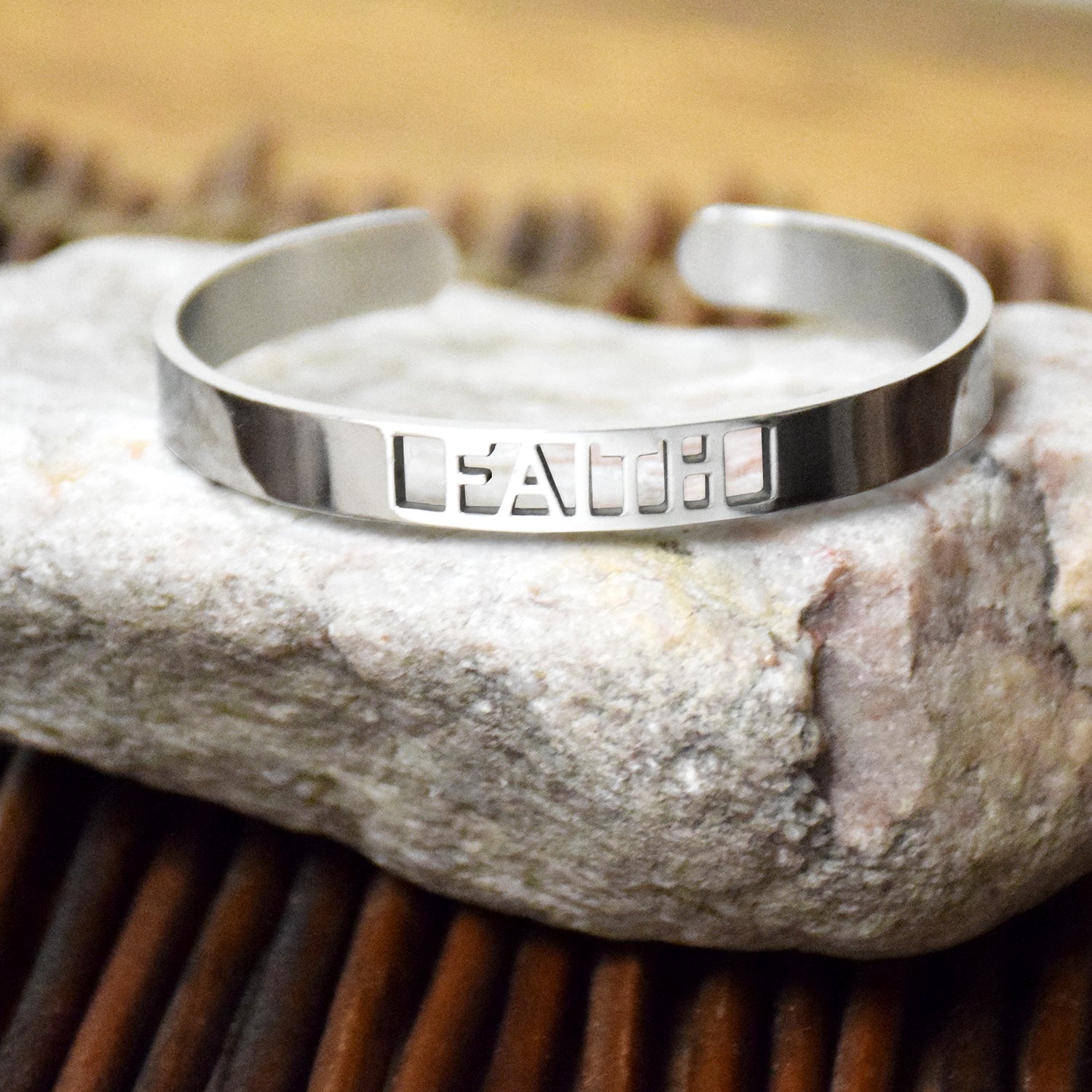 This FAITH cutout bangle bracelet is not only stylish but comfortable. The band is approximately 1/4" wide and includes the word "FAITH" cut out of the front.