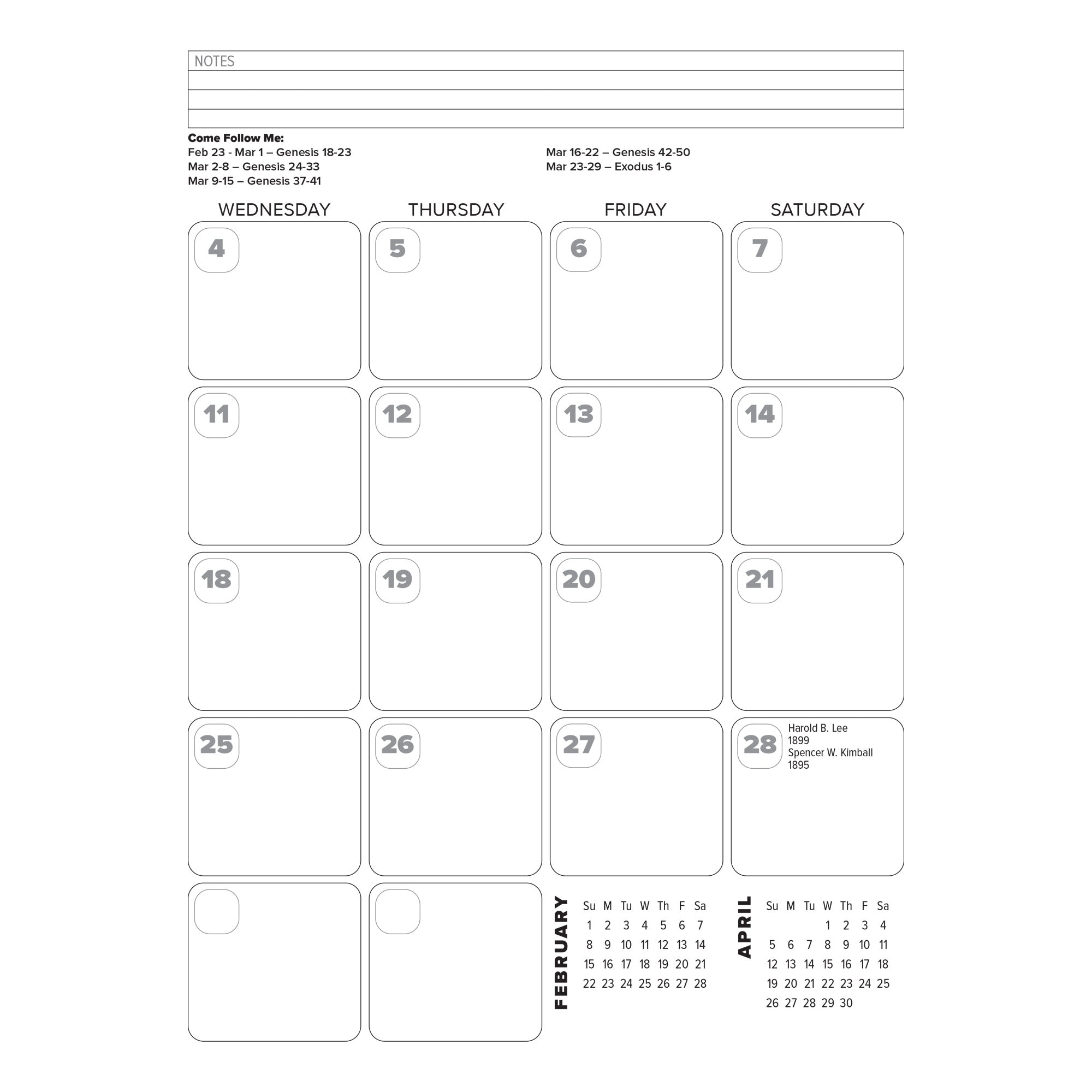 Featuring write-in monthly calendars with large Sunday spaces (perfect for your busiest day of service), this planner also includes note sections, uplifting quotes, and reminders for important church events, such as general conference.