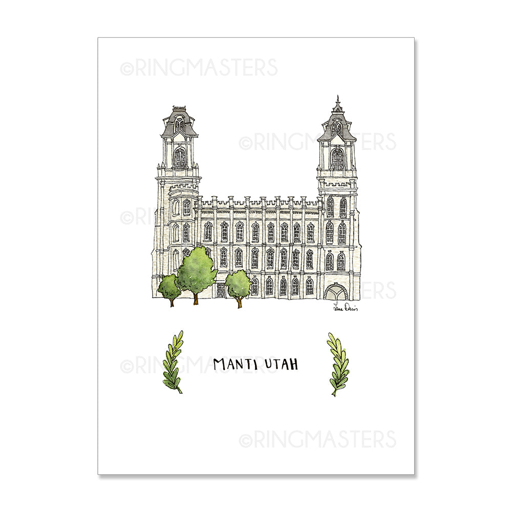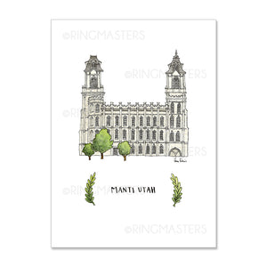 Gift this beautiful Manti Temple 3x4" Each print is printed on a quality cardstock and makes a great gift for all from loved ones to your primary class! From Ringmasters. The world leader in gifts for members of the Church of Jesus Christ of Latter-day Saints