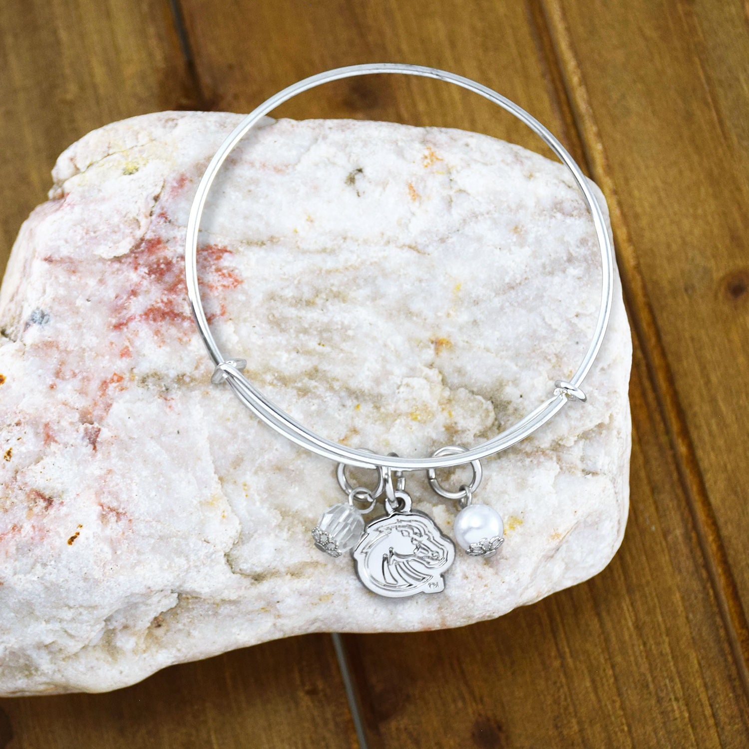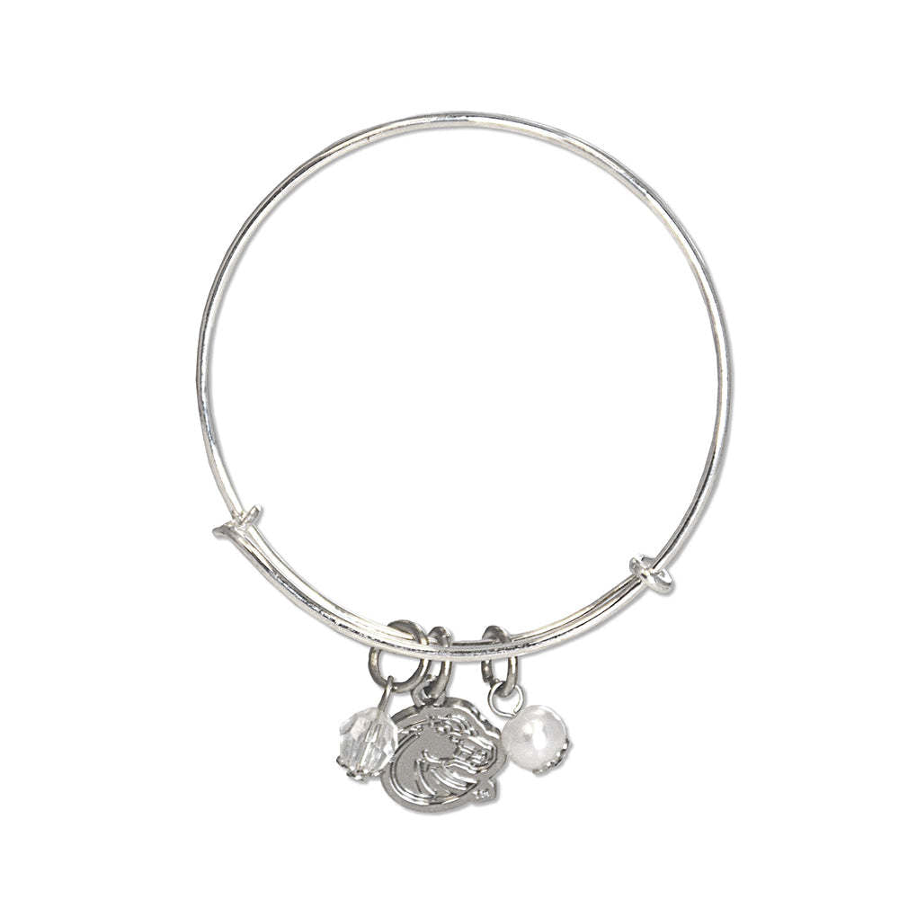 Celebrate every aspect of being a fan, with this officially licensed Boise State Bangle Bracelet. The Boise State logo is featured on the center charm and is complimented by a rhinestone and white imitation pearl. Bracelet is adjustable from 7-8 inches and is the perfect game day accessory! You can personilize this popular bracelet by adding more charms. Comes with a Fan Frenzy lifetime warranty.
