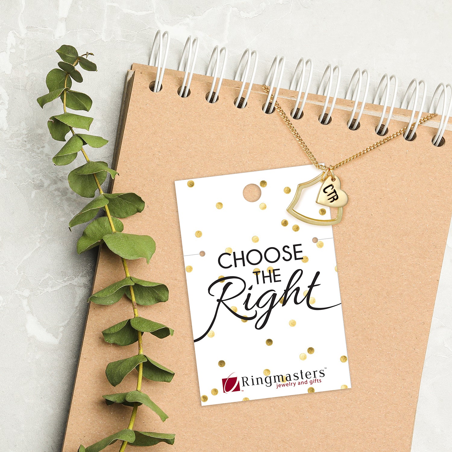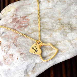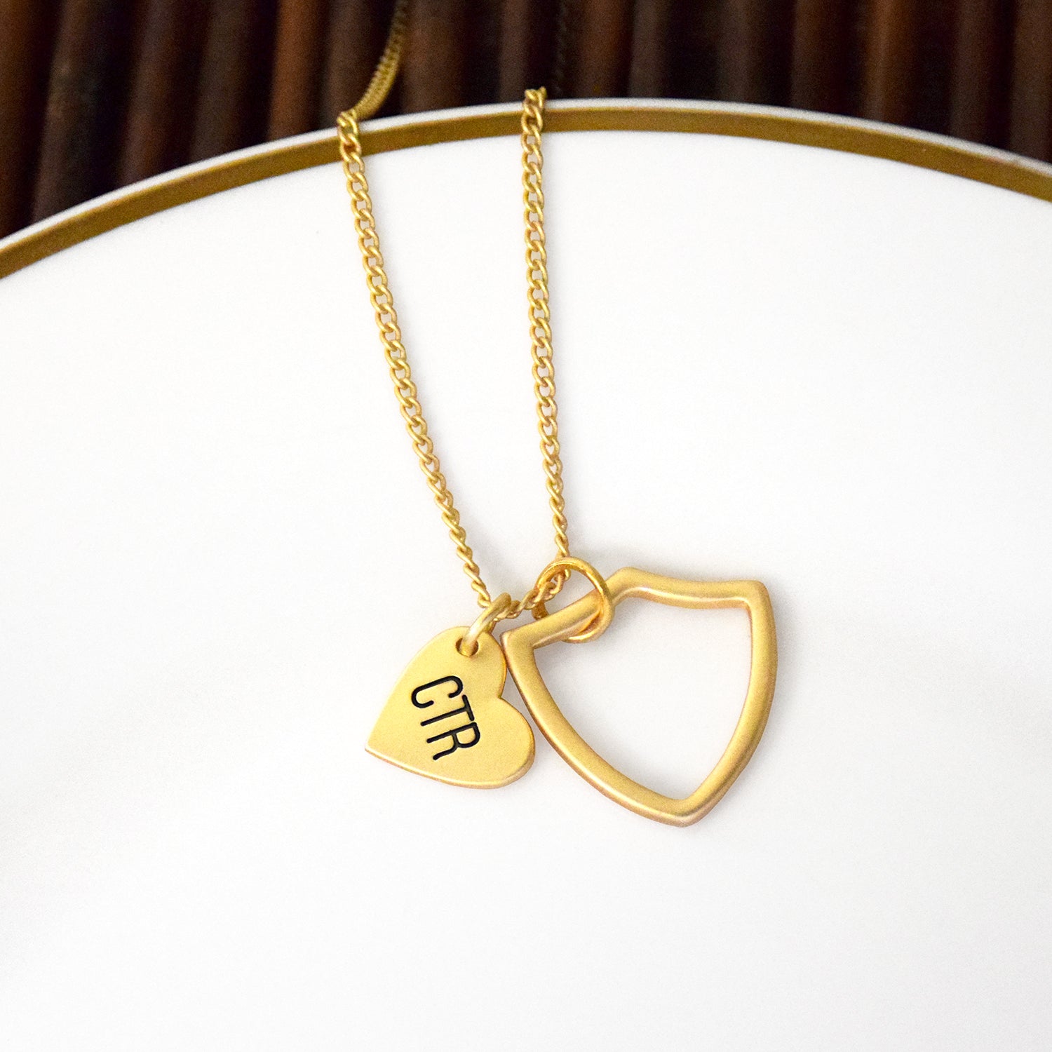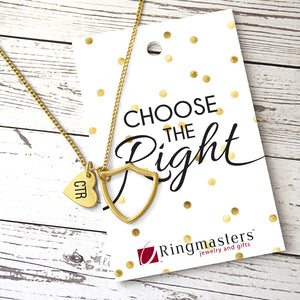 Gold finish shield-shaped pendant with overlapping CTR heart pendant. Includes an adjustable gold finish 18-20" curb link chain