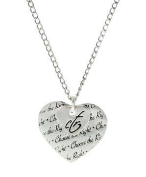 This heart necklace includes two heart charms. One small  heart with CTR engraved in black, and a larger heart with "choose the right" across the charm. The largest pendant is approximately 7/8" and comes competed on a 18-20" adjustable chain.
