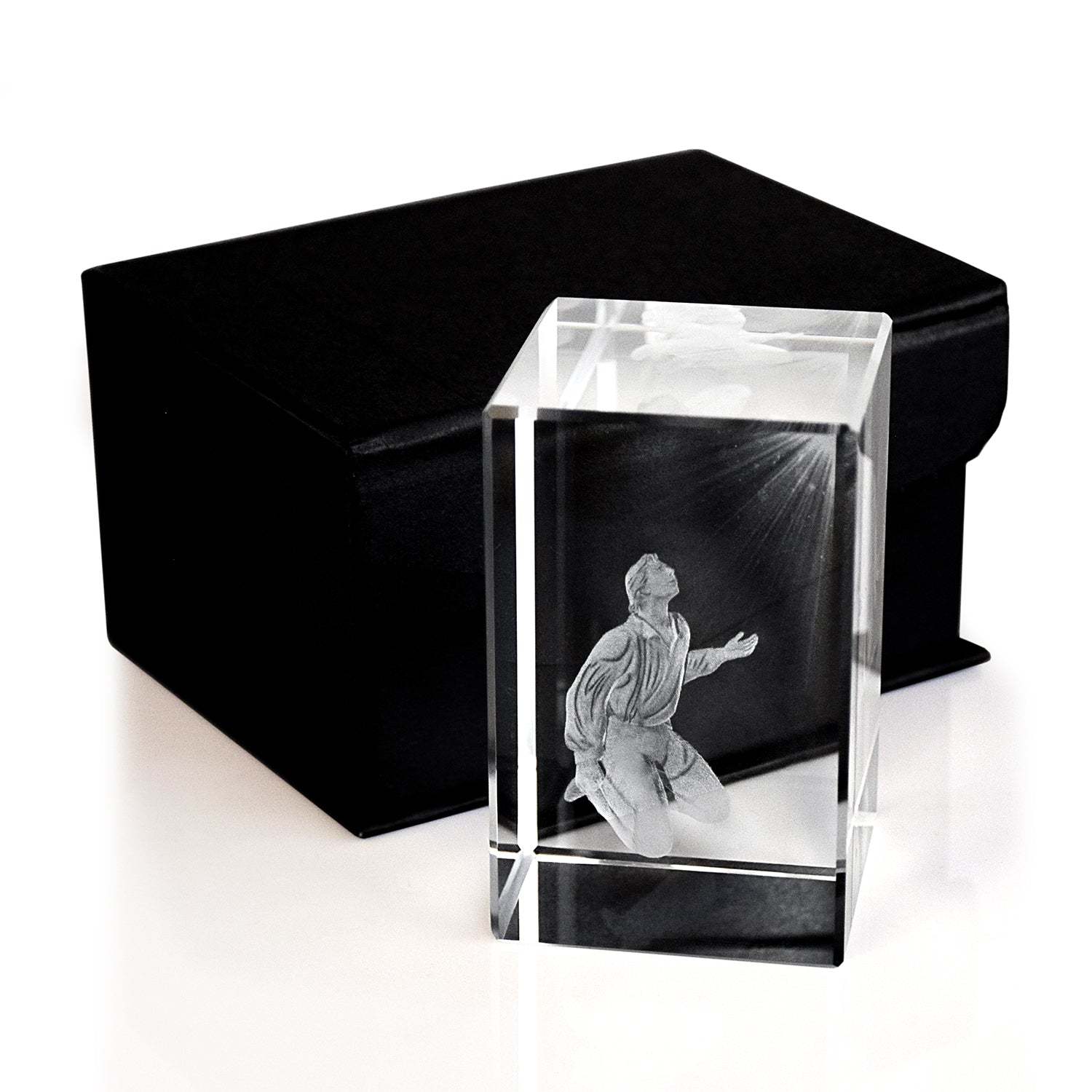 This beautiful laser engraved crystal cube makes for a perfect wedding or anniversary gifts. Together with a lighted rotating base, these 3D pieces of art make for a great decoration on a table or shelf. Each cube is packaged in a beautiful velvet-lined gift box. This cube is: 5cm x 5cm x 8cm.
