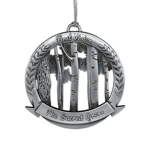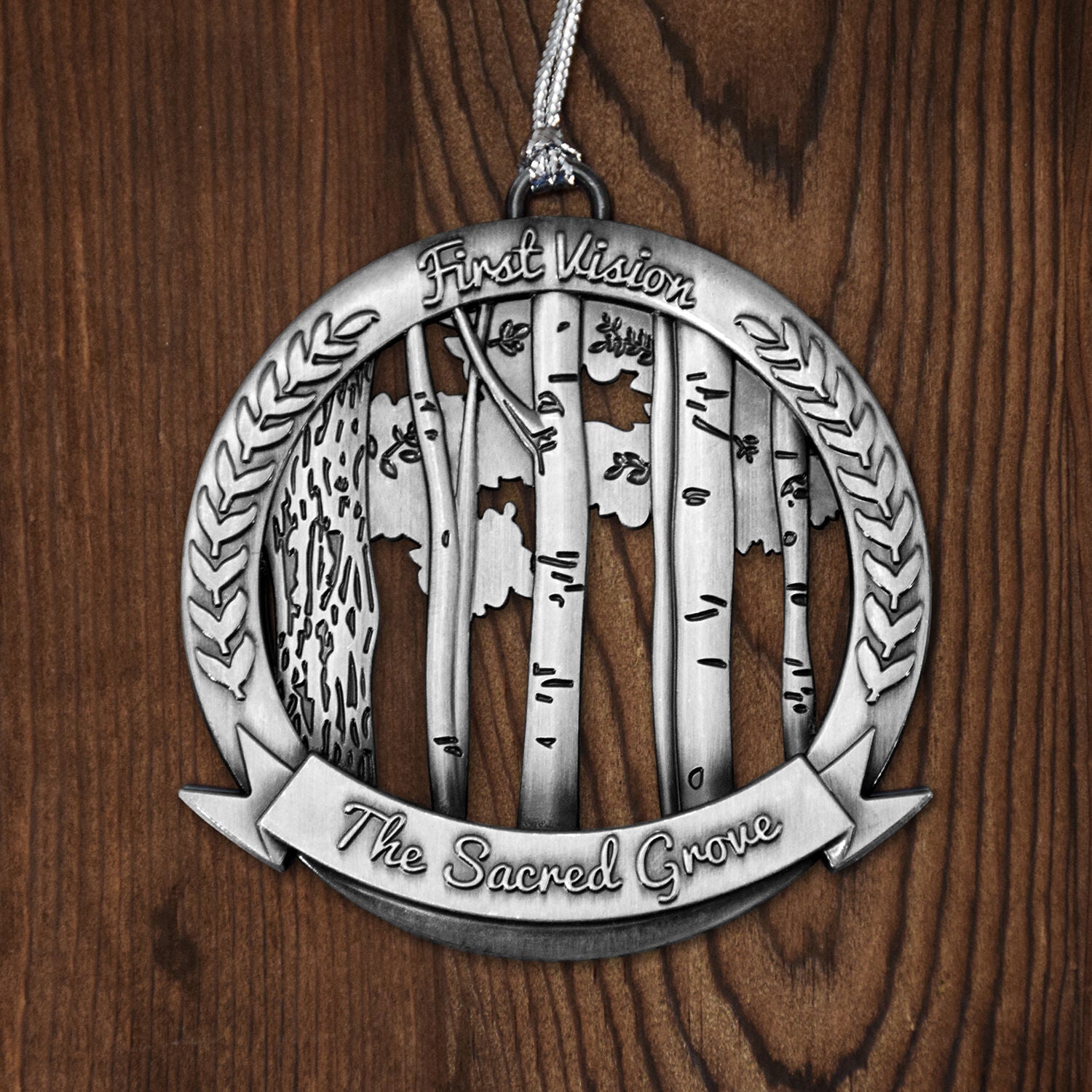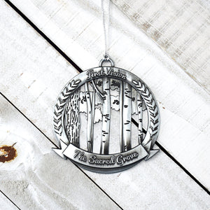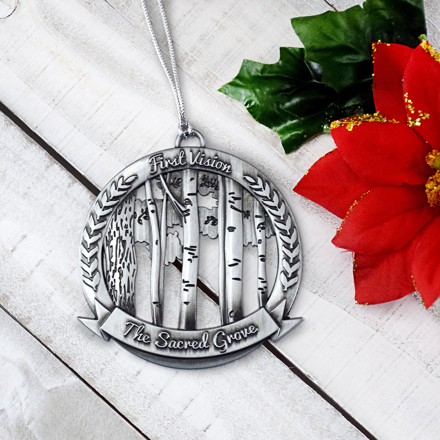 This keepsake ornament proudly displays the beautiful Sacred Grove temple in an antique silver finish. The ornament is 3" inches in diameter and features a silver string attachment to hang on your Christmas tree or a chrome plated ornament stand also available from Ringmasters. Perfect for weddings or anniversaries, bring this beautiful momento ornament into your home.