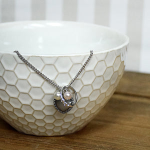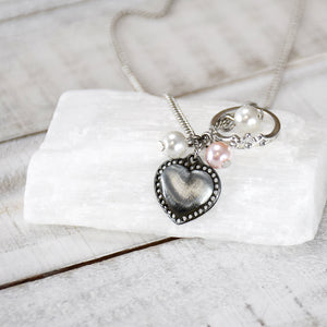 This necklace features several pearl charms and a gorgeous silver antiqued heart pendant on an 18-20" curb linked chain. Wear it to remind yourself that no matter how it appears when you first come across it, there is potential for great things in even the smallest grain of sand.