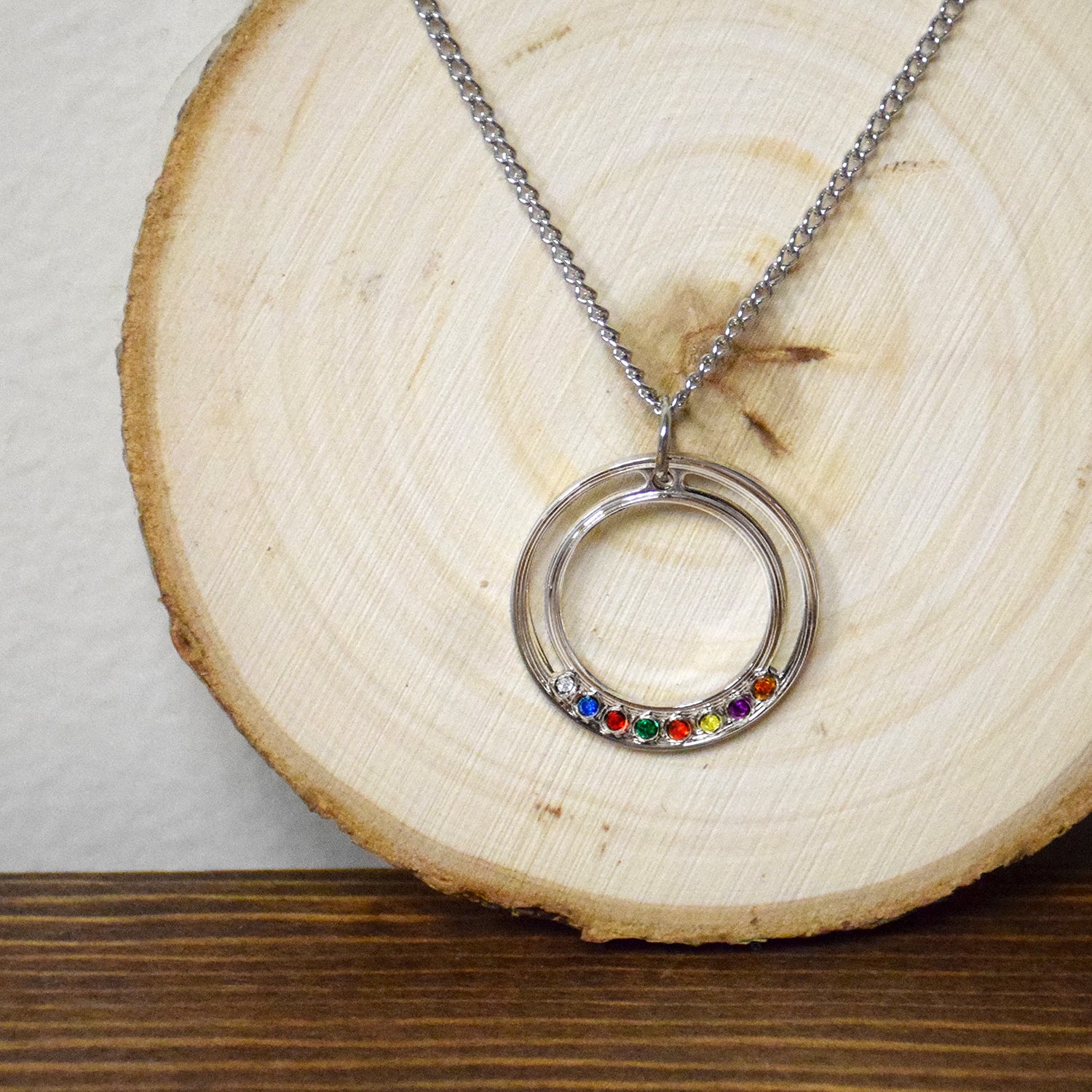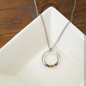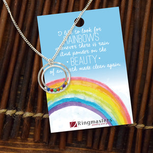 This adorable baptism necklace comes with 8 rainbow-colored stones inlaid in a silver finish circle pendant. The look is completed with an "I like to look for rainbows" baptism rainbow backer card. The circle pendant is approximately 1" and comes on an 18-20" adjustable chain.