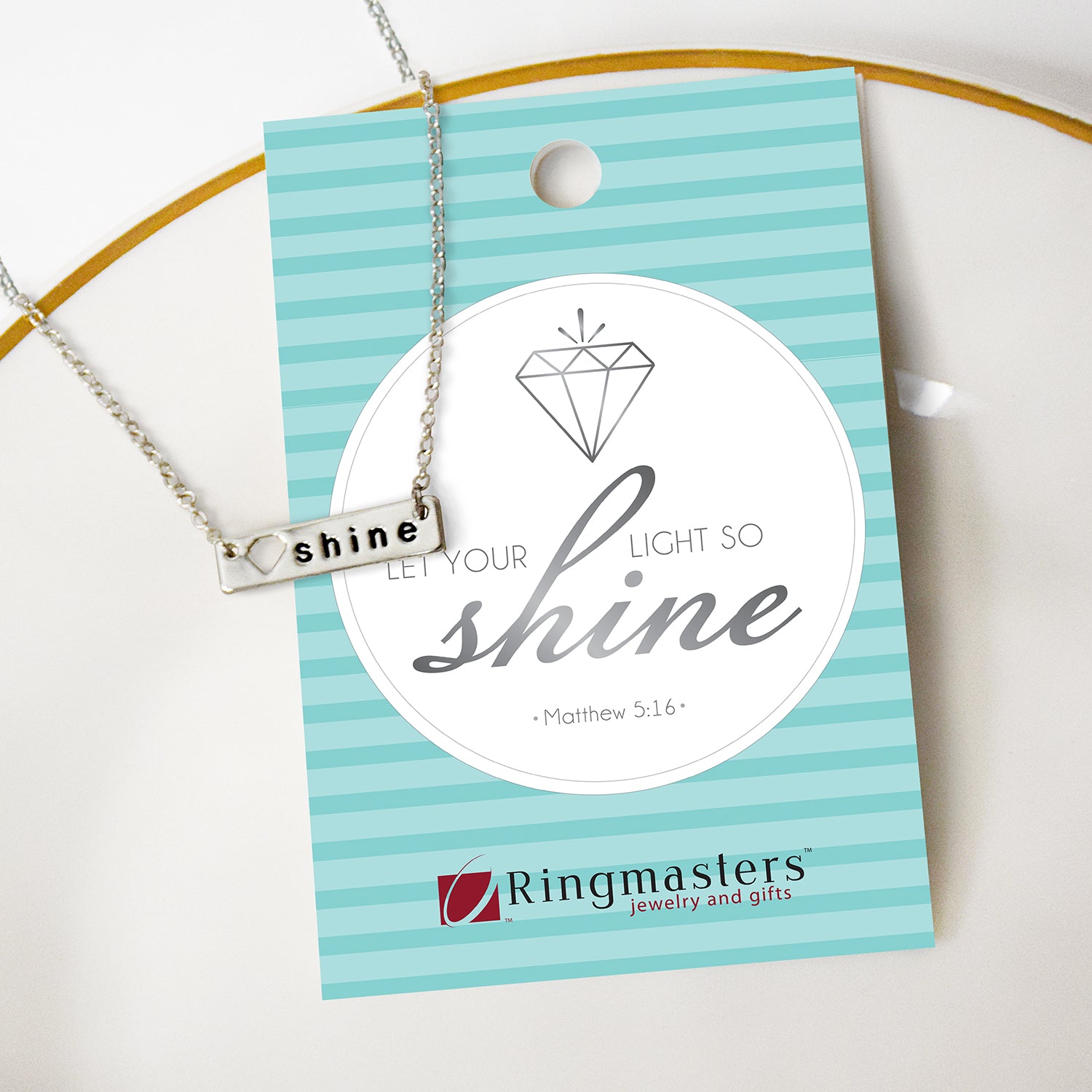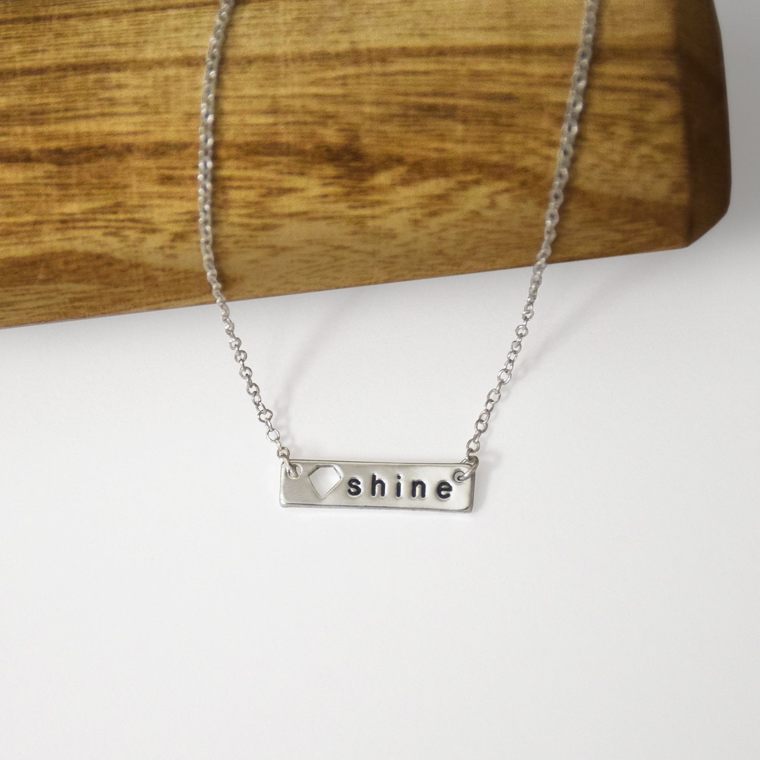 This dainty SHINE bar necklace comes with a cutout diamond shape and is completed on a 16 - 18" adjustable chain.