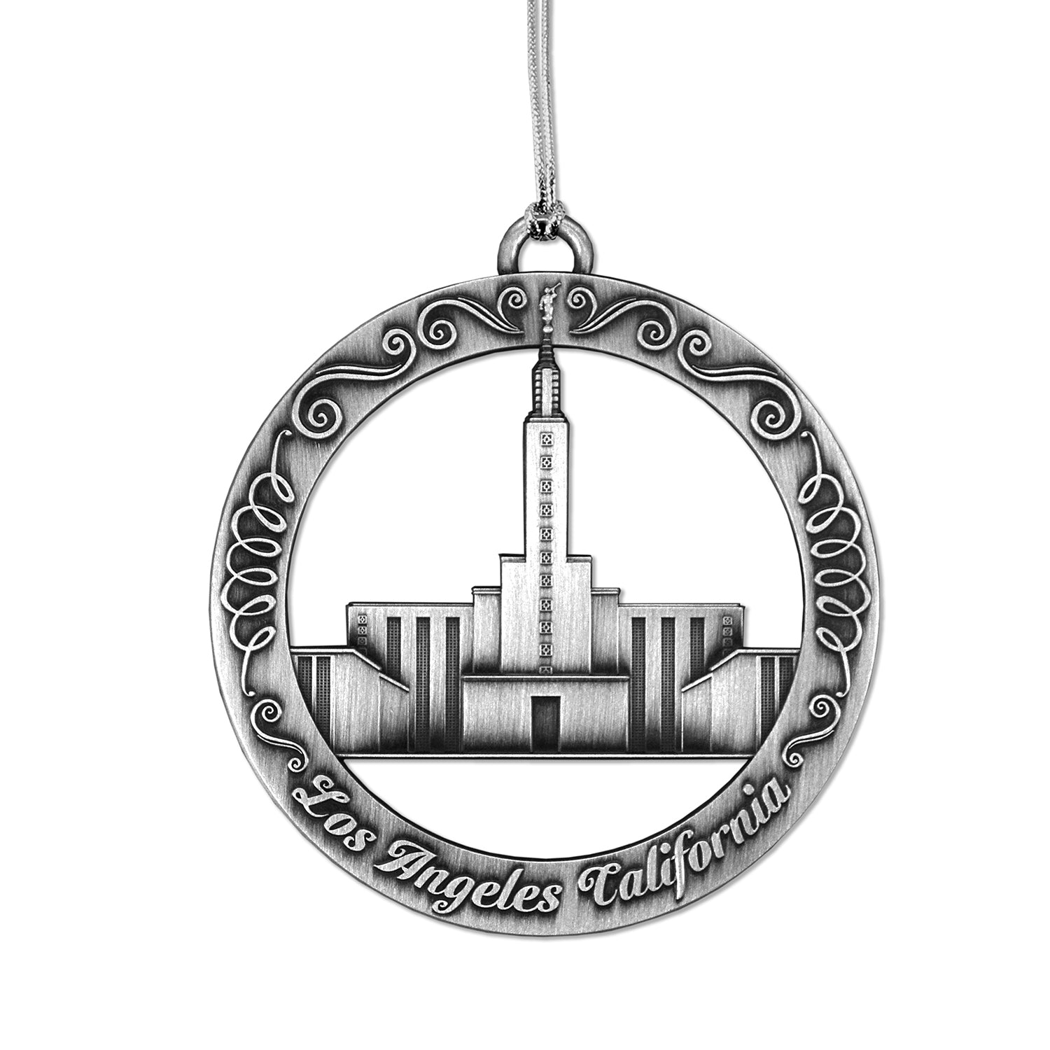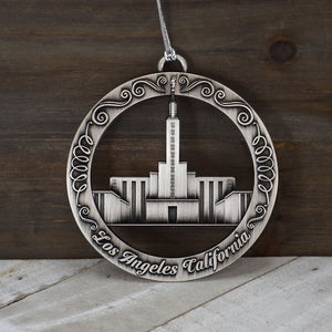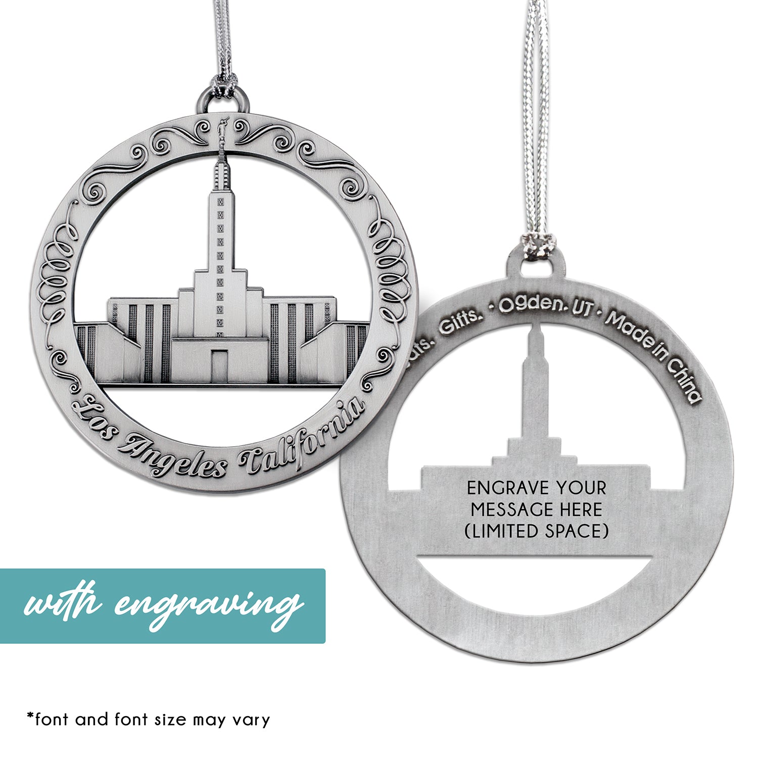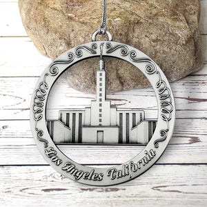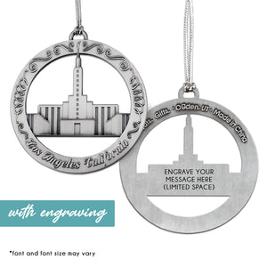 This keepsake ornament proudly displays the beautiful temple in an antique silver finish. The ornament is 3" inches in diameter and features a silver string attachment to hang on your Christmas tree or a chrome plated ornament stand also available from Ringmasters. Perfect for weddings or anniversaries, bring this beautiful temple ornament into your home.