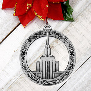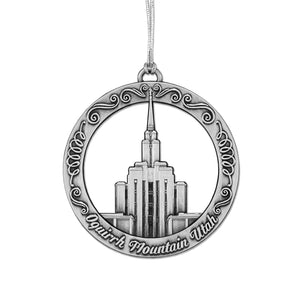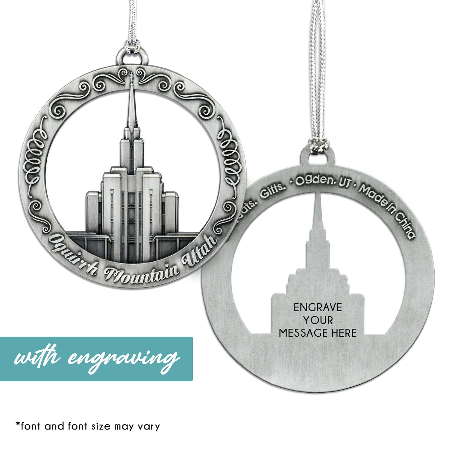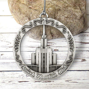 This keepsake ornament proudly displays the beautiful temple in an antique silver finish. The ornament is 3" inches in diameter and features a silver string attachment to hang on your Christmas tree or a chrome plated ornament stand also available from Ringmasters. Perfect for weddings or anniversaries, bring this beautiful temple ornament into your home.