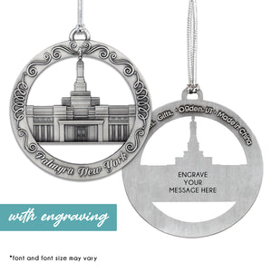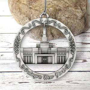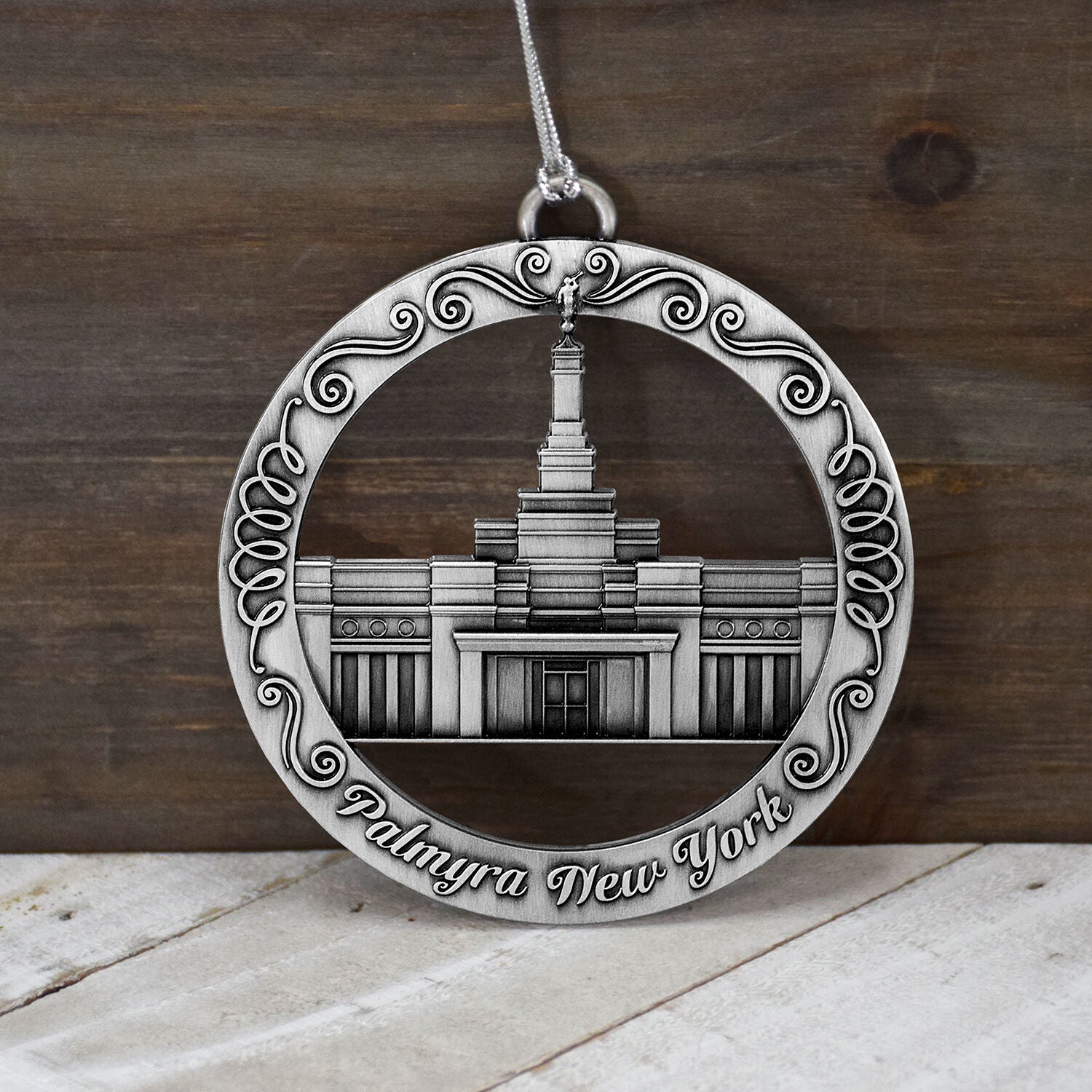 This keepsake ornament proudly displays the beautiful temple in an antique silver finish. The ornament is 3" inches in diameter and features a silver string attachment to hang on your Christmas tree or a chrome plated ornament stand also available from Ringmasters. Perfect for weddings or anniversaries, bring this beautiful temple ornament into your home.