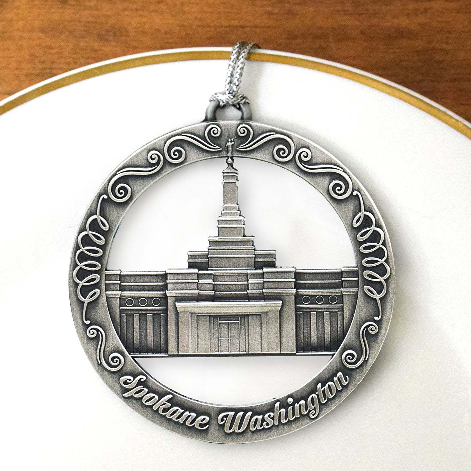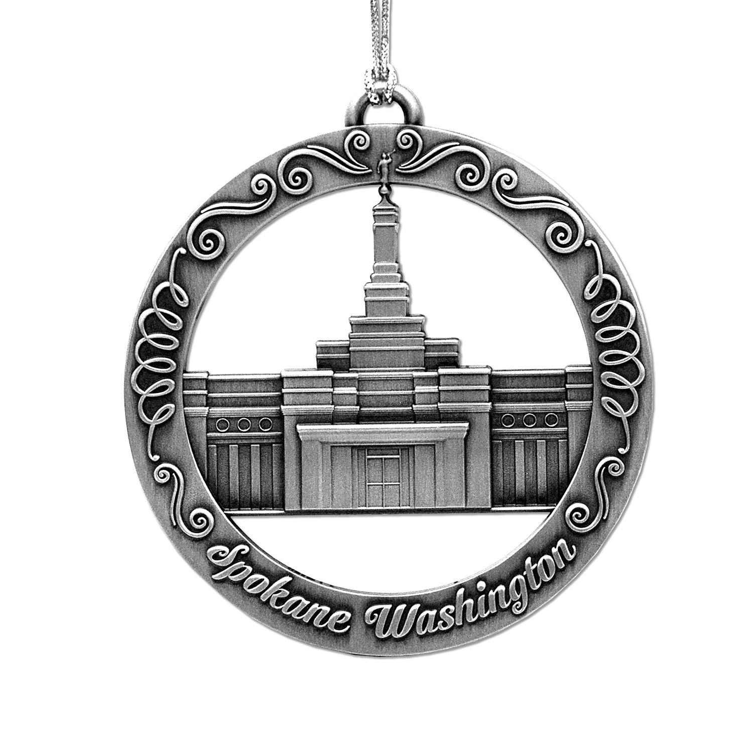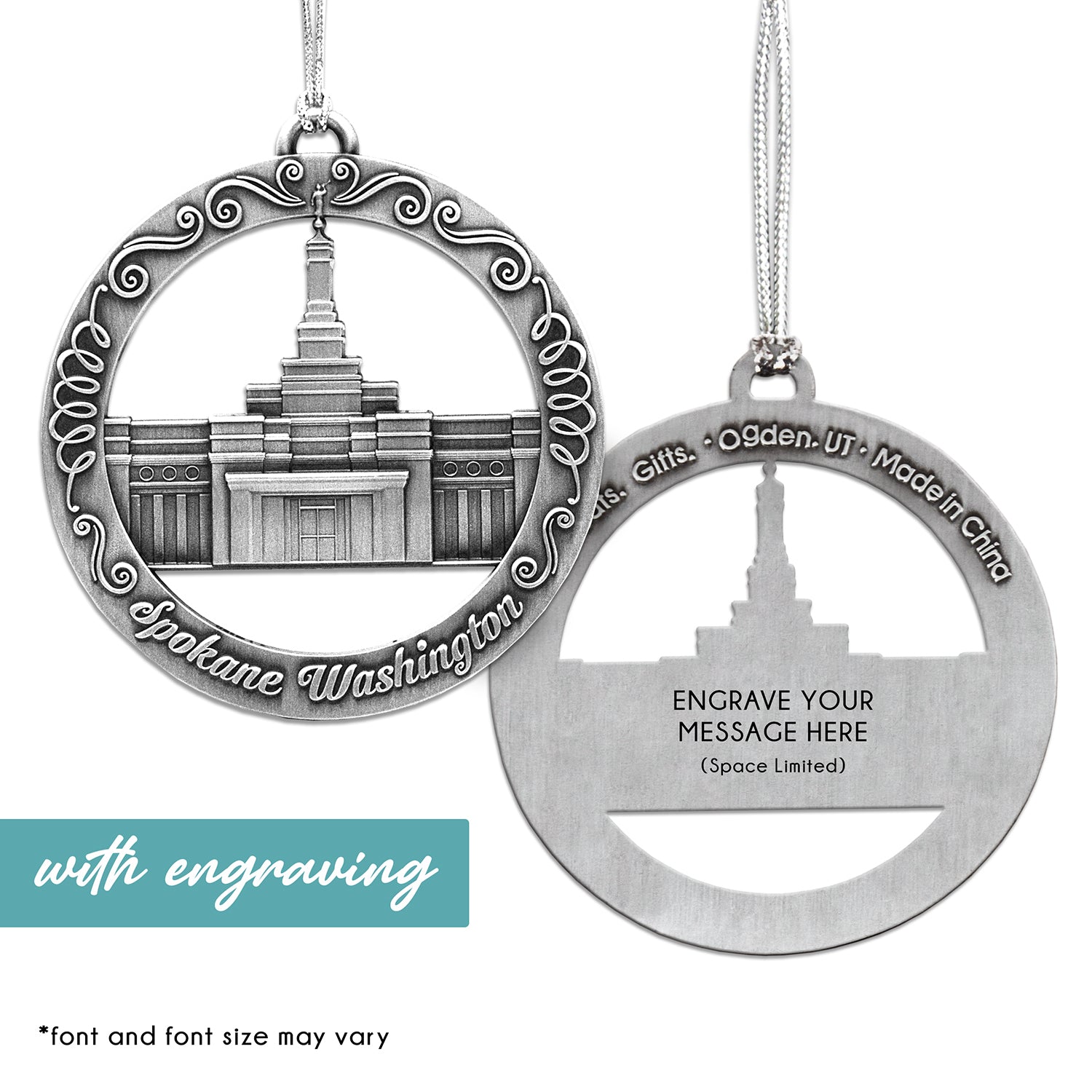 This keepsake ornament proudly displays the beautiful Spokane Washington temple in an antique silver finish. The ornament is 3" inches in diameter and features a silver string attachment to hang on your Christmas tree or a chrome plated ornament stand also available from Ringmasters. Perfect for weddings or anniversaries, bring this beautiful temple ornament into your home.