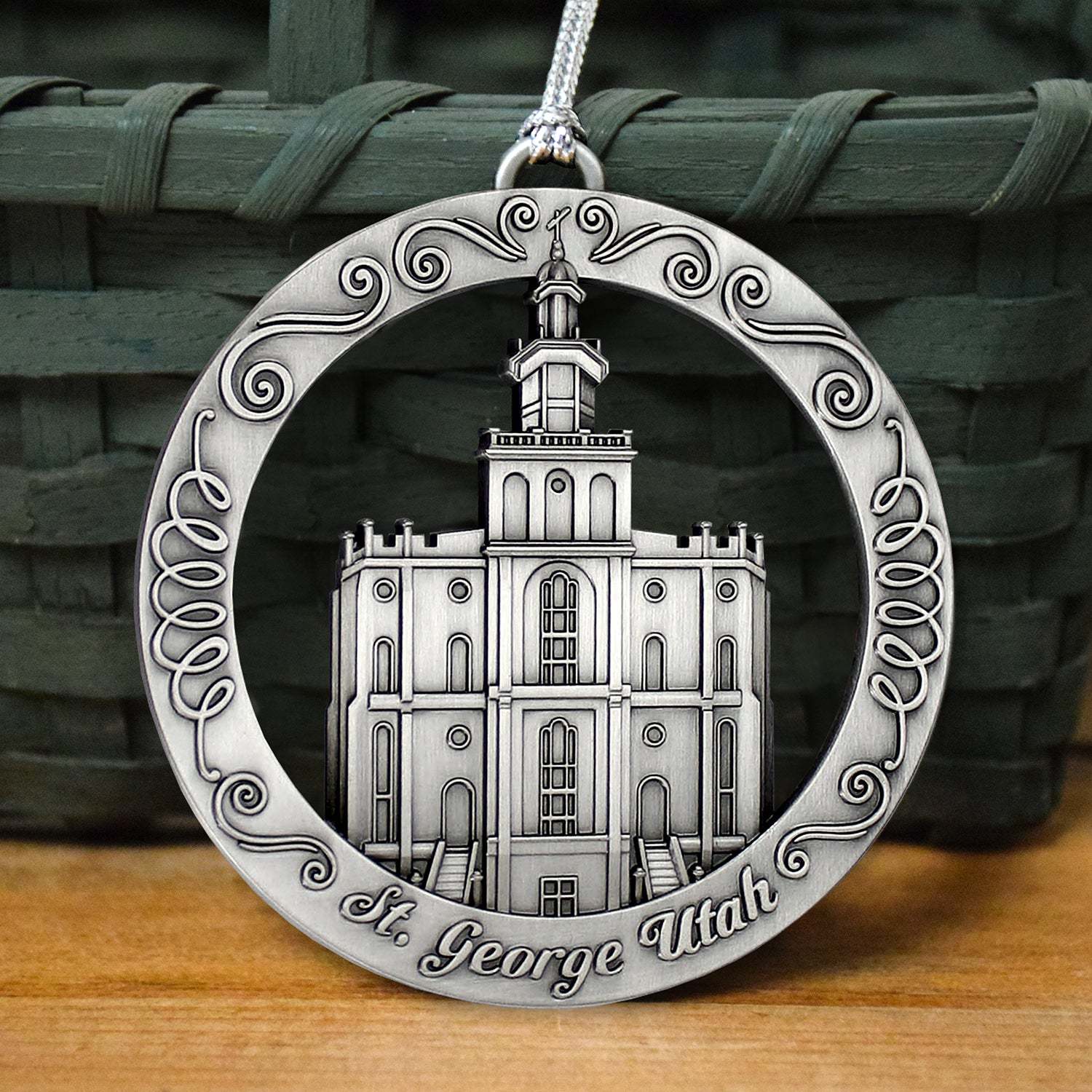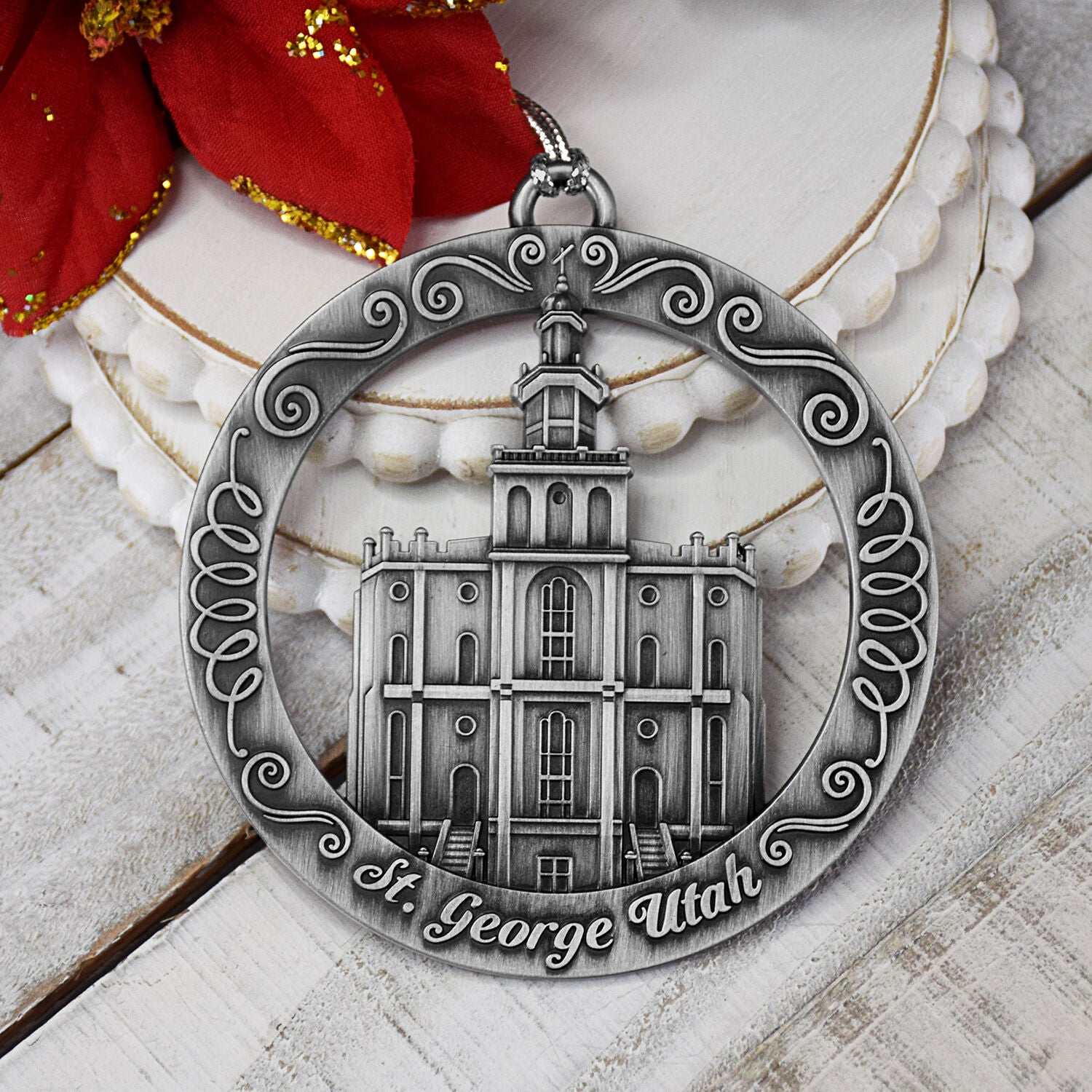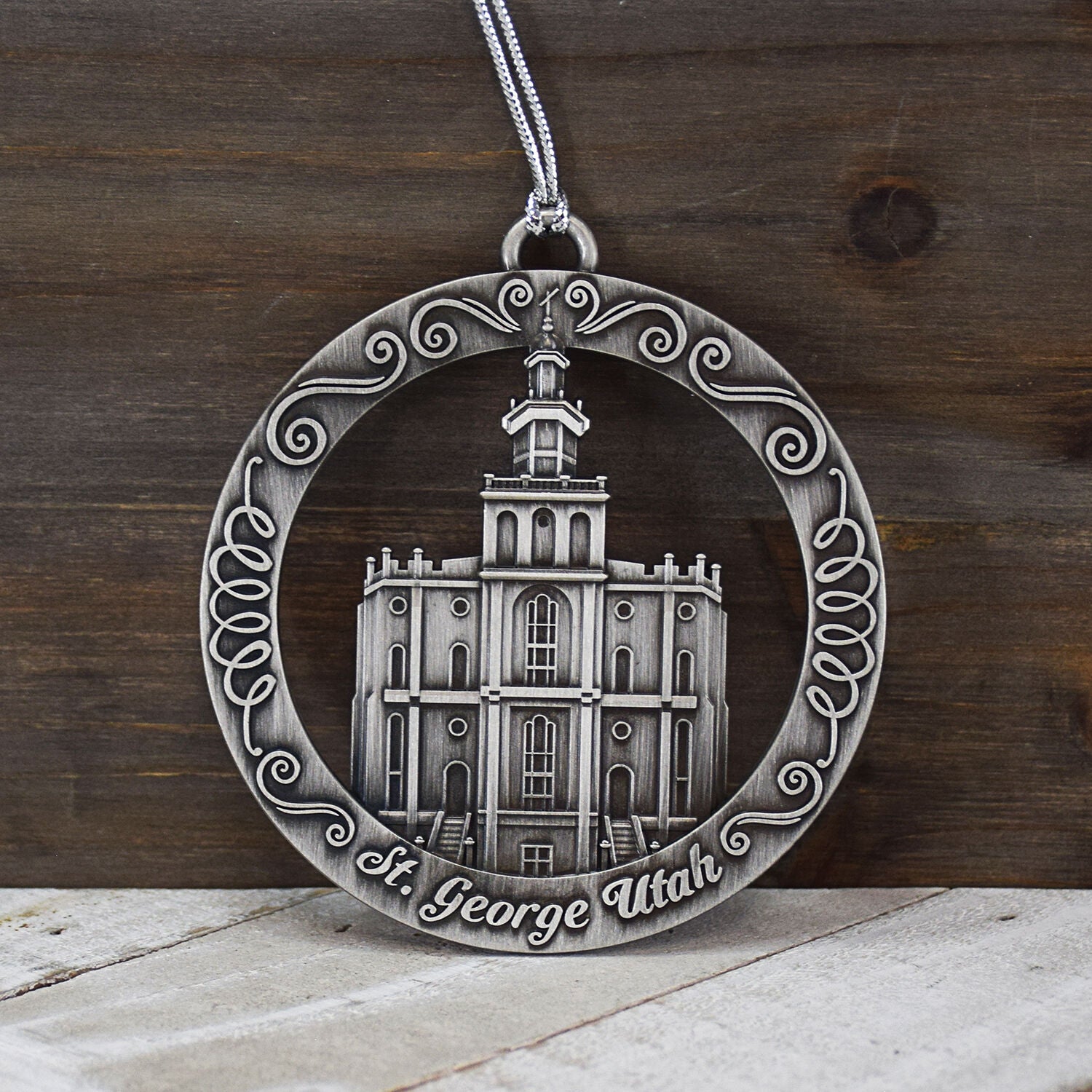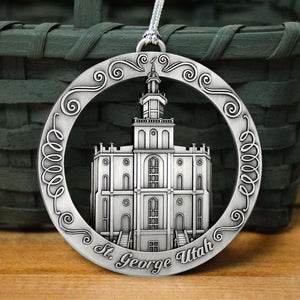 This keepsake ornament proudly displays the beautiful temple in an antique silver finish. The ornament is 3" inches in diameter and features a silver string attachment to hang on your Christmas tree or a chrome plated ornament stand also available from Ringmasters. Perfect for weddings or anniversaries, bring this beautiful temple ornament into your home.