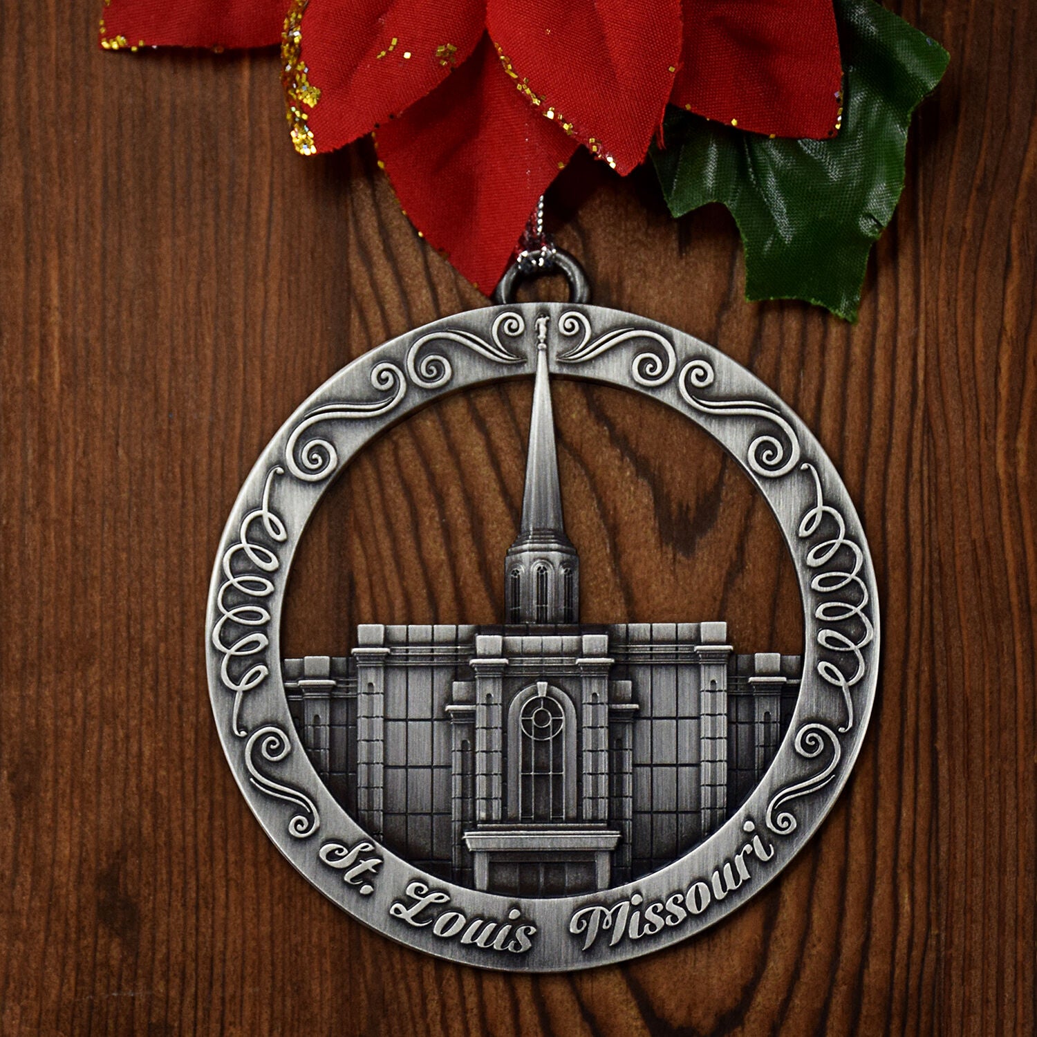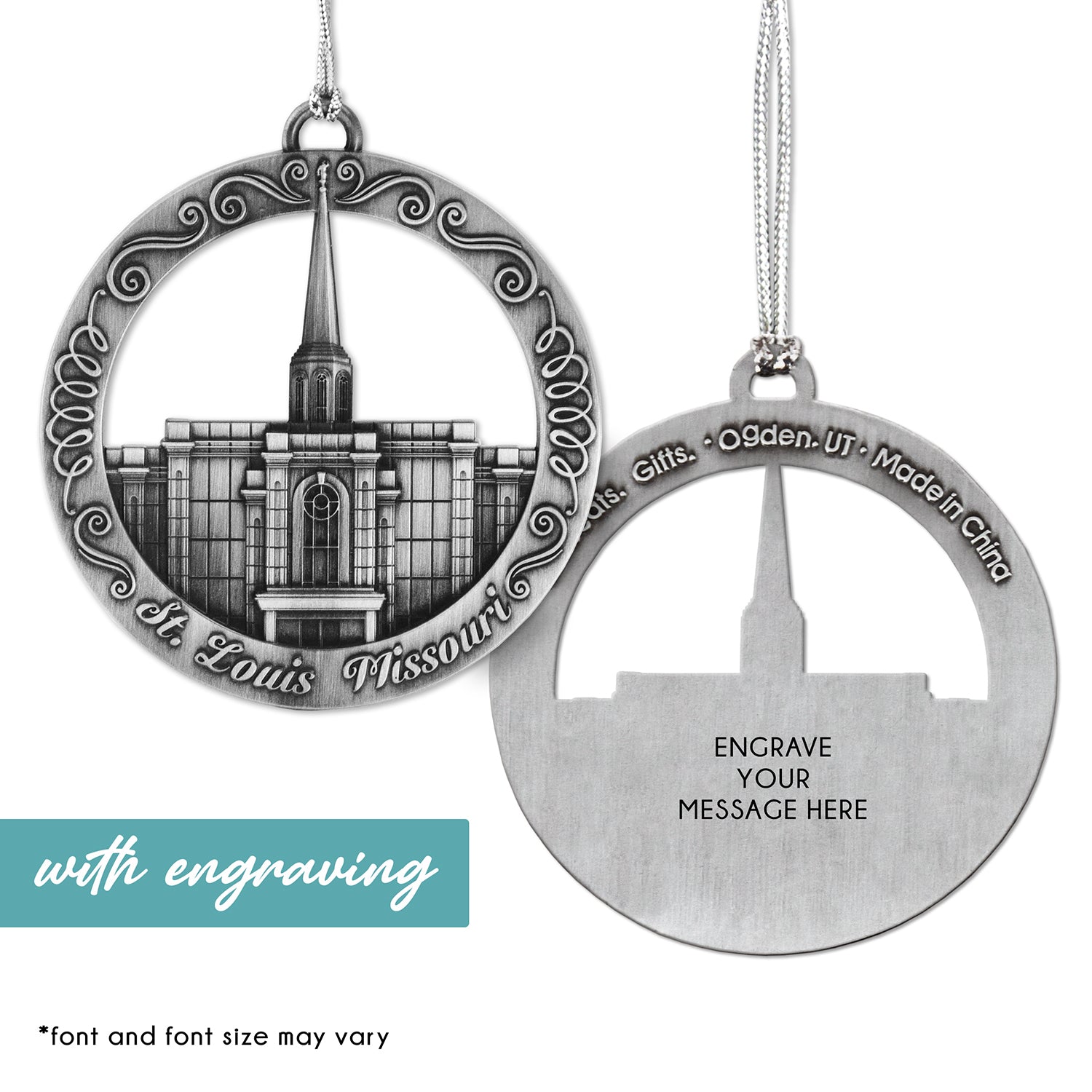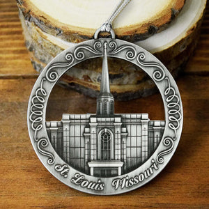 This keepsake ornament proudly displays the beautiful St. Louis Missouri temple in an antique silver finish. The ornament is 3" inches in diameter and features a silver string attachment to hang on your Christmas tree or a chrome plated ornament stand also available from Ringmasters. Perfect for weddings or anniversaries, bring this beautiful temple ornament into your home.