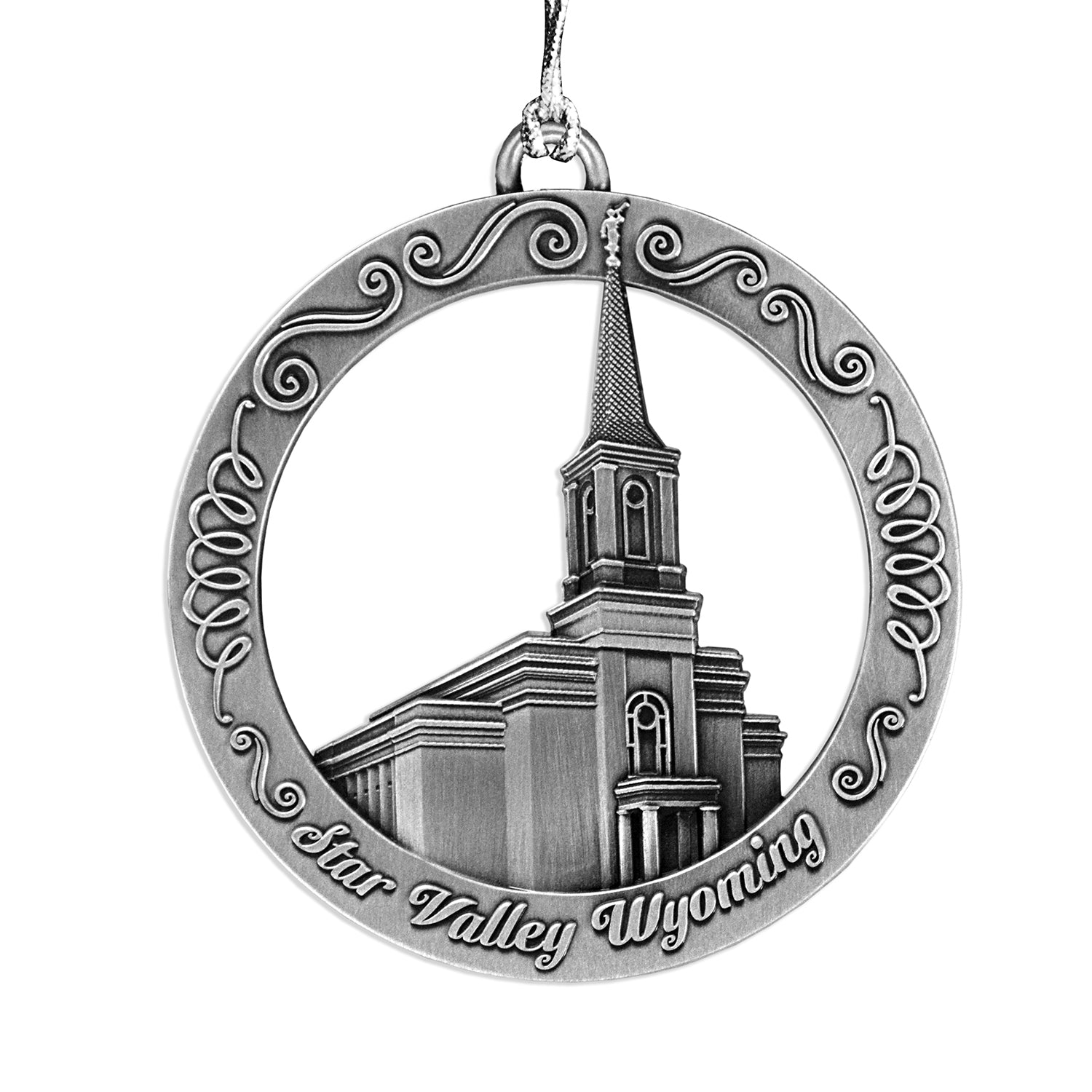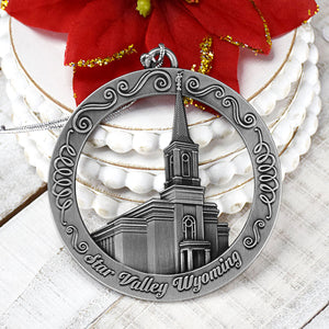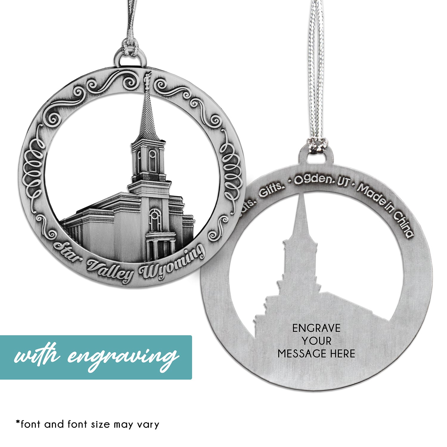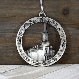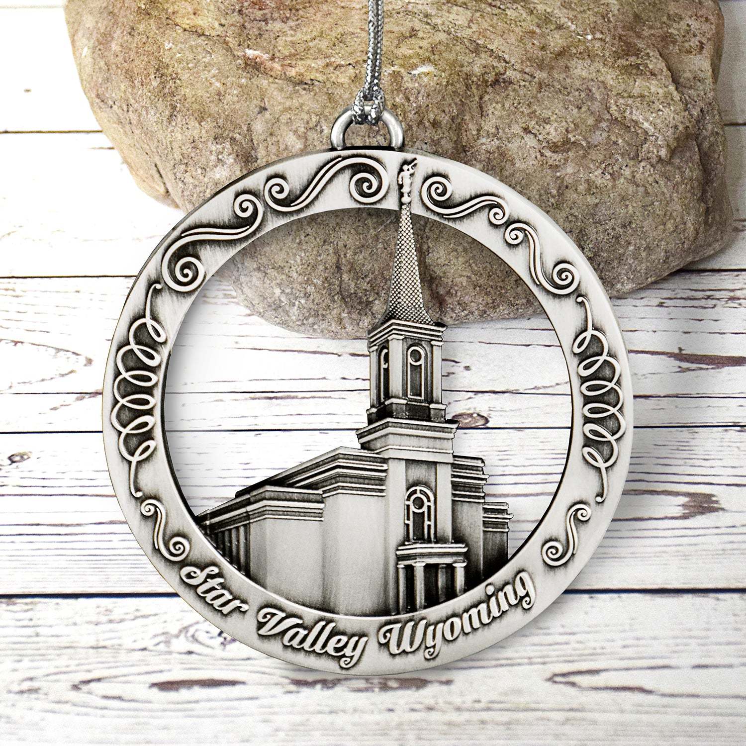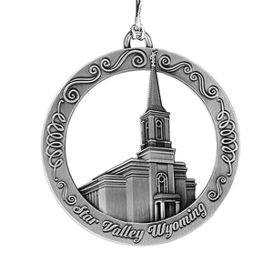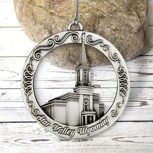 This keepsake ornament proudly displays the beautiful Star Valley Wyoming temple in an antique silver finish. The ornament is 3" inches in diameter and features a silver string attachment to hang on your Christmas tree or a chrome plated ornament stand also available from Ringmasters. Perfect for weddings or anniversaries, bring this beautiful temple ornament into your home.