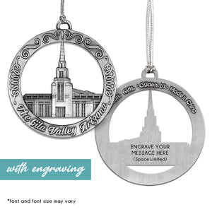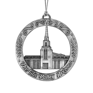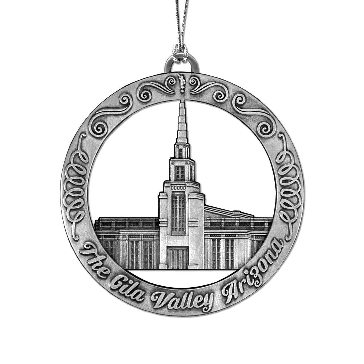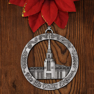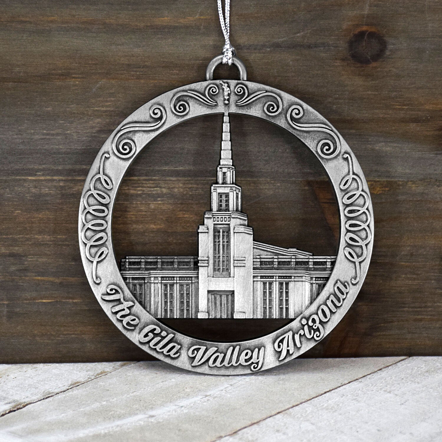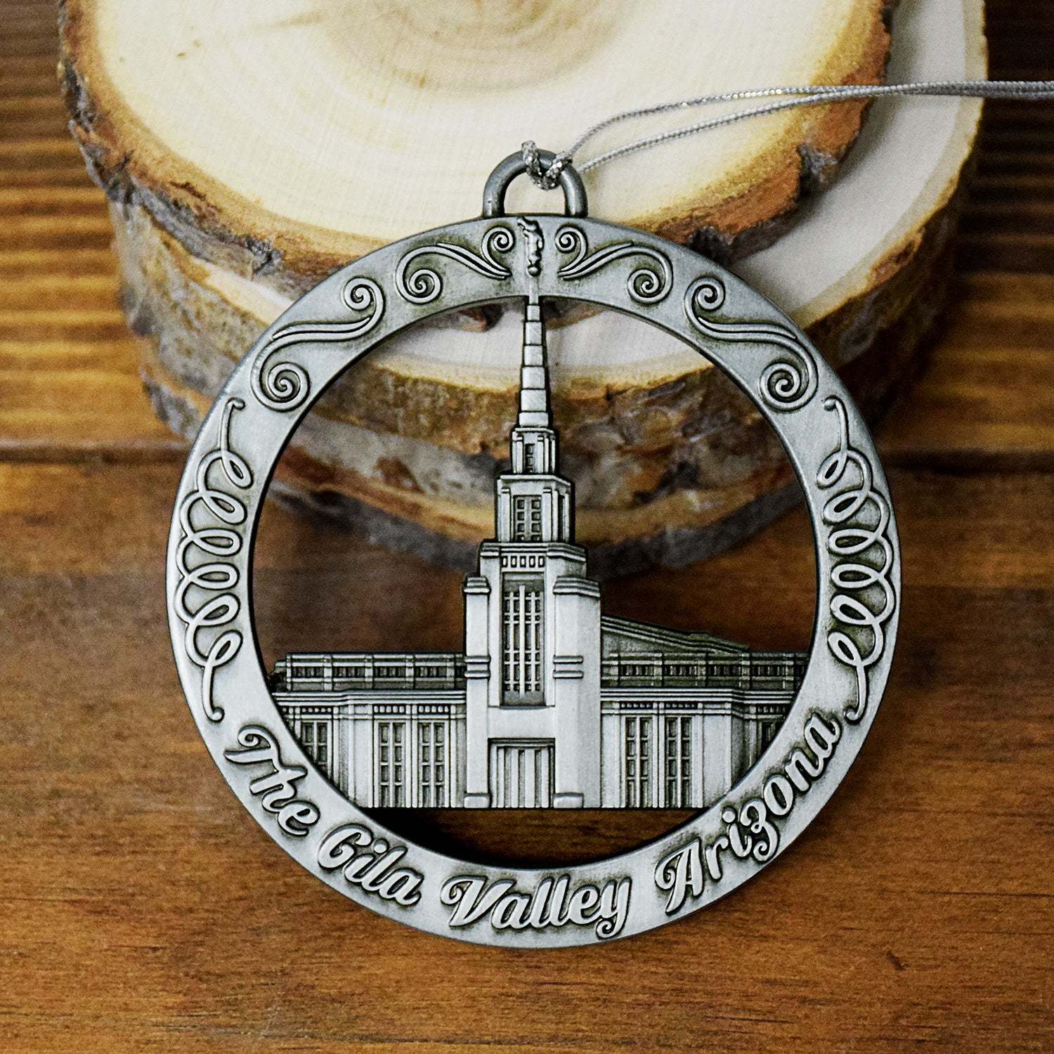 This keepsake ornament proudly displays the beautiful Gila Valley Arizona temple in an antique silver finish. The ornament is 3" inches in diameter and features a silver string attachment to hang on your Christmas tree or a chrome plated ornament stand also available from Ringmasters. Perfect for weddings or anniversaries, bring this beautiful temple ornament into your home.